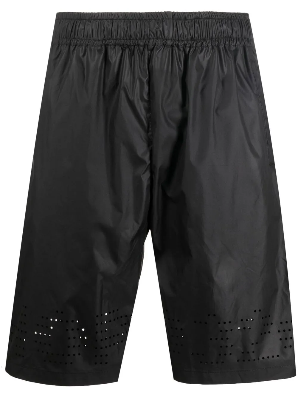 Noir, détails de perforations, ceinture élastique, construction stretch, hauteur genou, deux poches latérales fendues, poche arrière passepoilée.