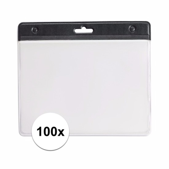 Badgehouders setje van 100x stuks in het zwart. Deze badgehouders / naamkaarthouders worden veelvoudig gebruikt op beurzen, kinderfeestjes en evenementen. Formaat: ongeveer 11,5 x 9,5 cm. Let op: exclusief keycord.