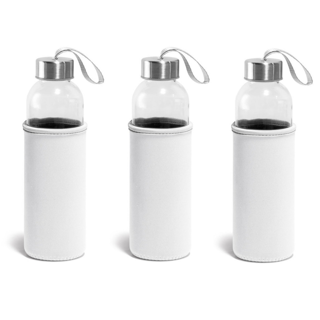 10x Glazen waterflessen/drinkflessen met witte soft shell hoes 520 ml. Transparanten glazen bidons/drinkflessen met aluminium dop en witte soft shell hoes. De inhoud per fles is ca. 520 ml. Formaat fles: ca. 6,5 cm in diameter en 22,5 cm in hoogte. Materiaal: glas, rvs en soft shell (stof). De flessen kunnen in de vaatwasser en zijn ook geschikt voor vriezer en magnetron. Drinkflessen/waterflessen voor onderweg. Sportfles/sportbidon voor tijdens fitness/hardlopen.