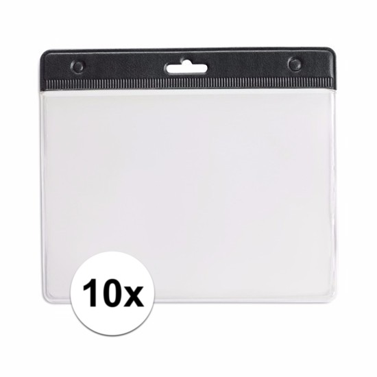 Badgehouders setje van 10x stuks in het zwart. Deze badgehouders / naamkaarthouders worden veelvoudig gebruikt op beurzen, kinderfeestjes en evenementen. Formaat: ongeveer 11,5 x 9,5 cm. Let op: exclusief keycord.