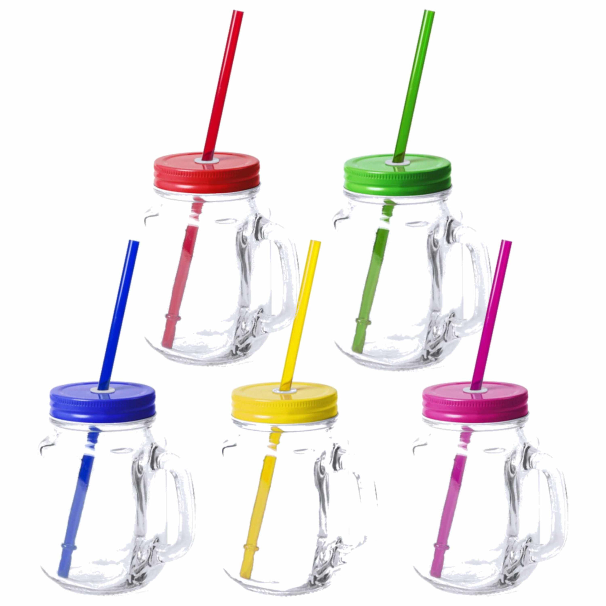 10x stuks Glazen Mason Jar drinkbekers/potjes met dop en rietje 500 ml. Leuke gekleurde zomerse bekers voor limonade, shakes, cocktails of mixes. Formaat ongeveer: 7,5 x 13,5 cm. 2x stuks per kleur. U ontvangt de kleuren rood, groen, geel, blauw en roze. Materiaal: glas. , Dit artikel bestaat uit:, 2x Mason Jar drinkbekers – glas – dop geel met rietje – 500 ml – afsluitbaar – fruit shakes, 2x Mason Jar drinkbekers – glas – dop blauw met rietje – 500 ml – afsluitbaar – fruit shakes, 2x Mason Jar drinkbekers – glas – dop roze met rietje – 500 ml – afsluitbaar – fruit shakes, 2x Mason Jar drinkbekers – glas – dop rood met rietje – 500 ml – afsluitbaar – fruit shakes, 2x Mason Jar drinkbekers – glas – dop groen met rietje – 500 ml – afsluitbaar – fruit shakes