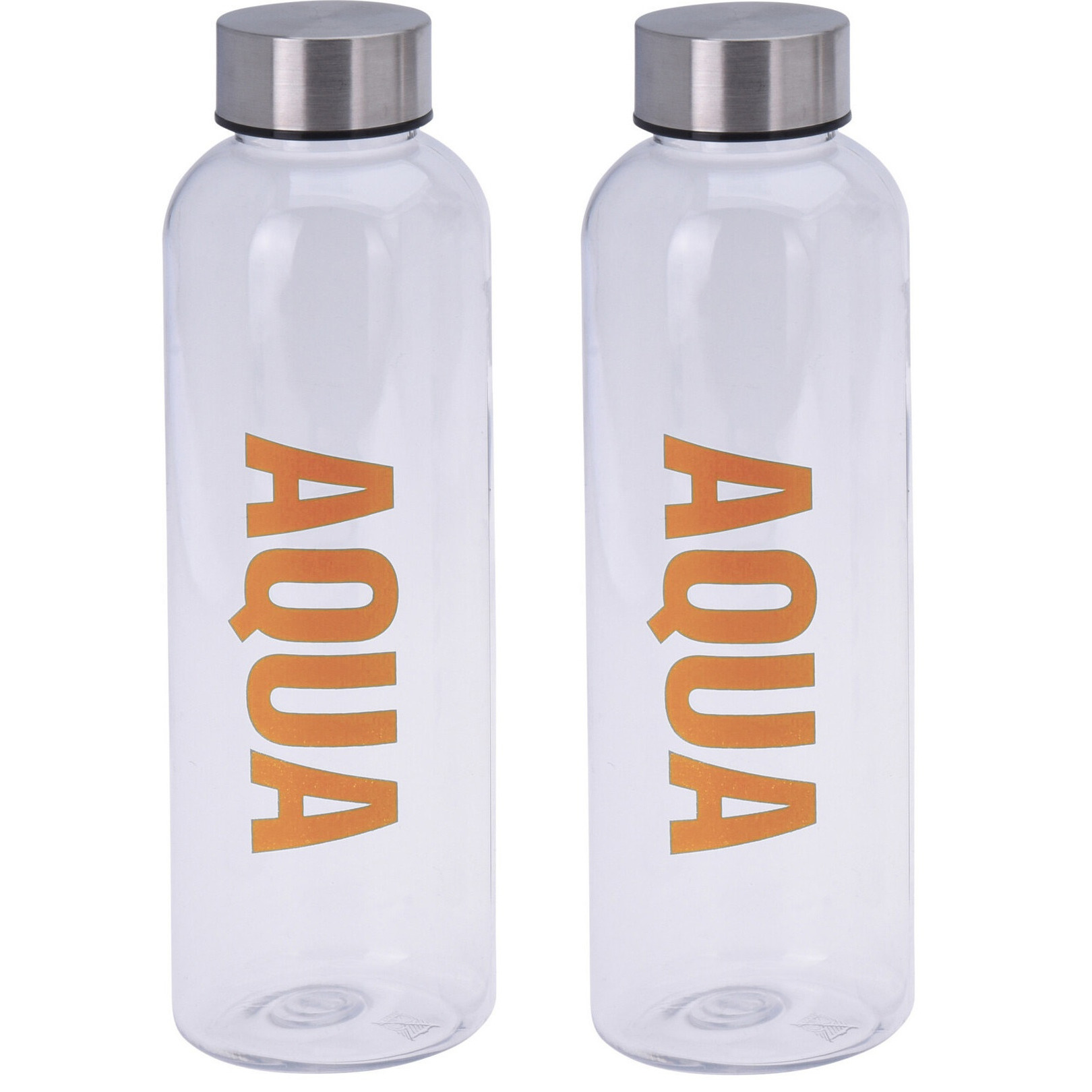 2x stuks bidon transparante drinkfles/waterfles met metalen schroefdop. De sport recreatie waterfles heeft een draaidop en tekst Aqua. Inhoud: 500 ml. Formaat: lengte 21 cm x breedte 6.5 cm. Materiaal: kunststof. Kleur tekst: oranje.
