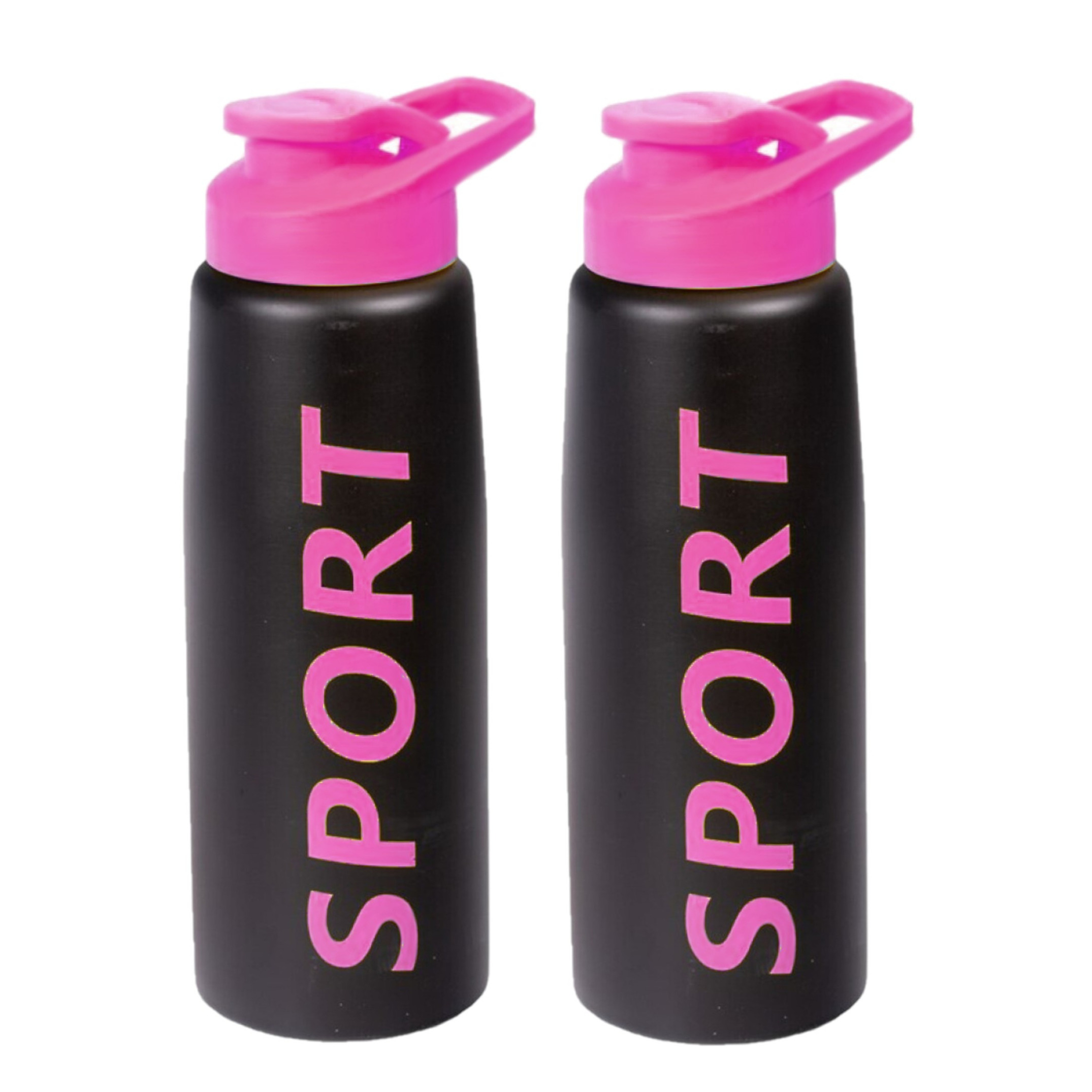 2x stuks bidon drinkflessen/waterflessen. De sportfles heeft een eenvoudig openingsmechanisme en draaidop. Inhoud: 850 ml. Formaat: lengte 9 cm x breedte 8 cm x hoogte 23 cm. Materiaal: aluminium. Kleur: fuchsia roze.