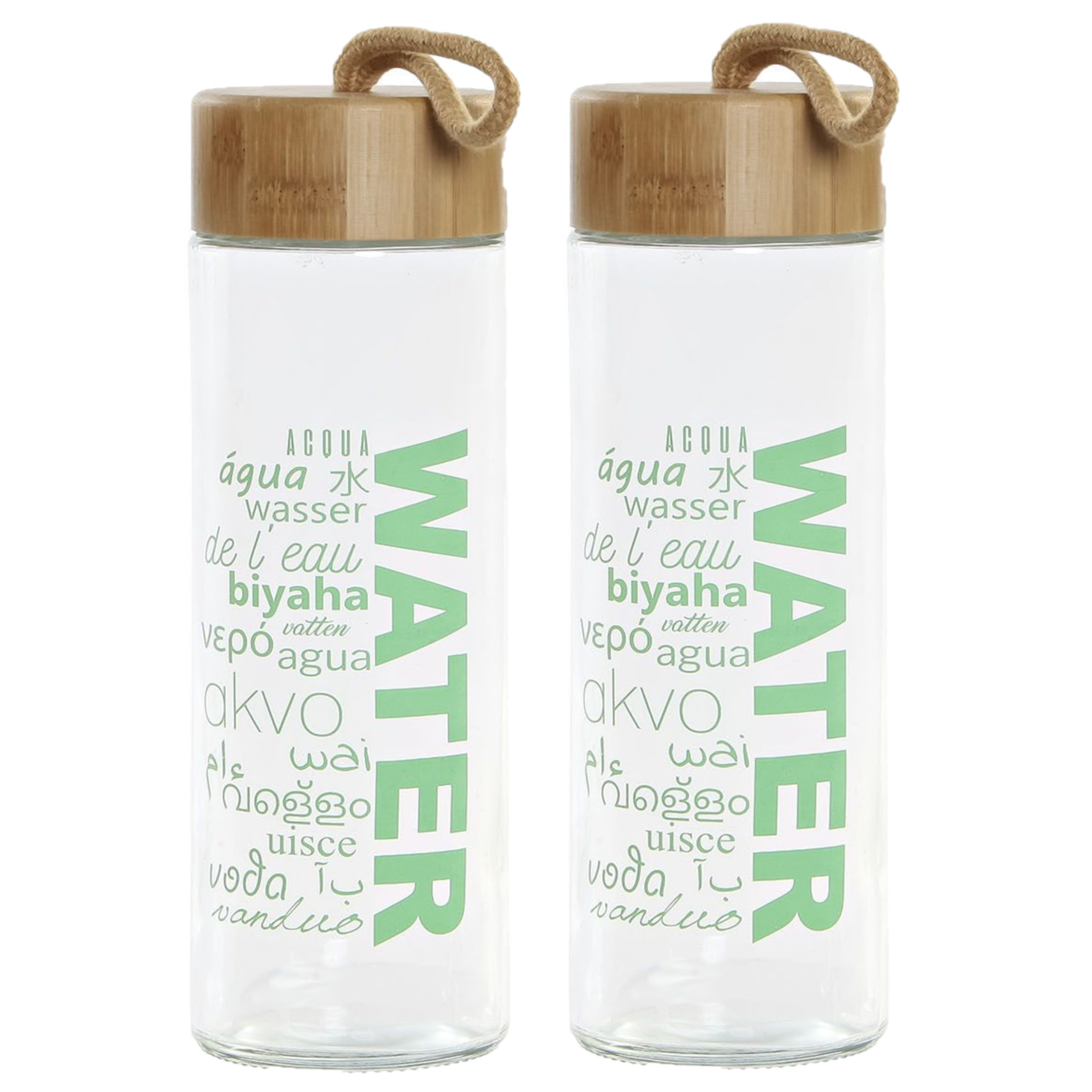 2x stuks glazen waterflessen/drinkflessen groen transparant met touwtje. Inhoud: ca. 580 ml, 58 cl. Afmetingen: D7 x H21 cm. BPA-vrij: ja. Geschikt voor magnetron: nee. Geschikt voor vaatwasser: ja.