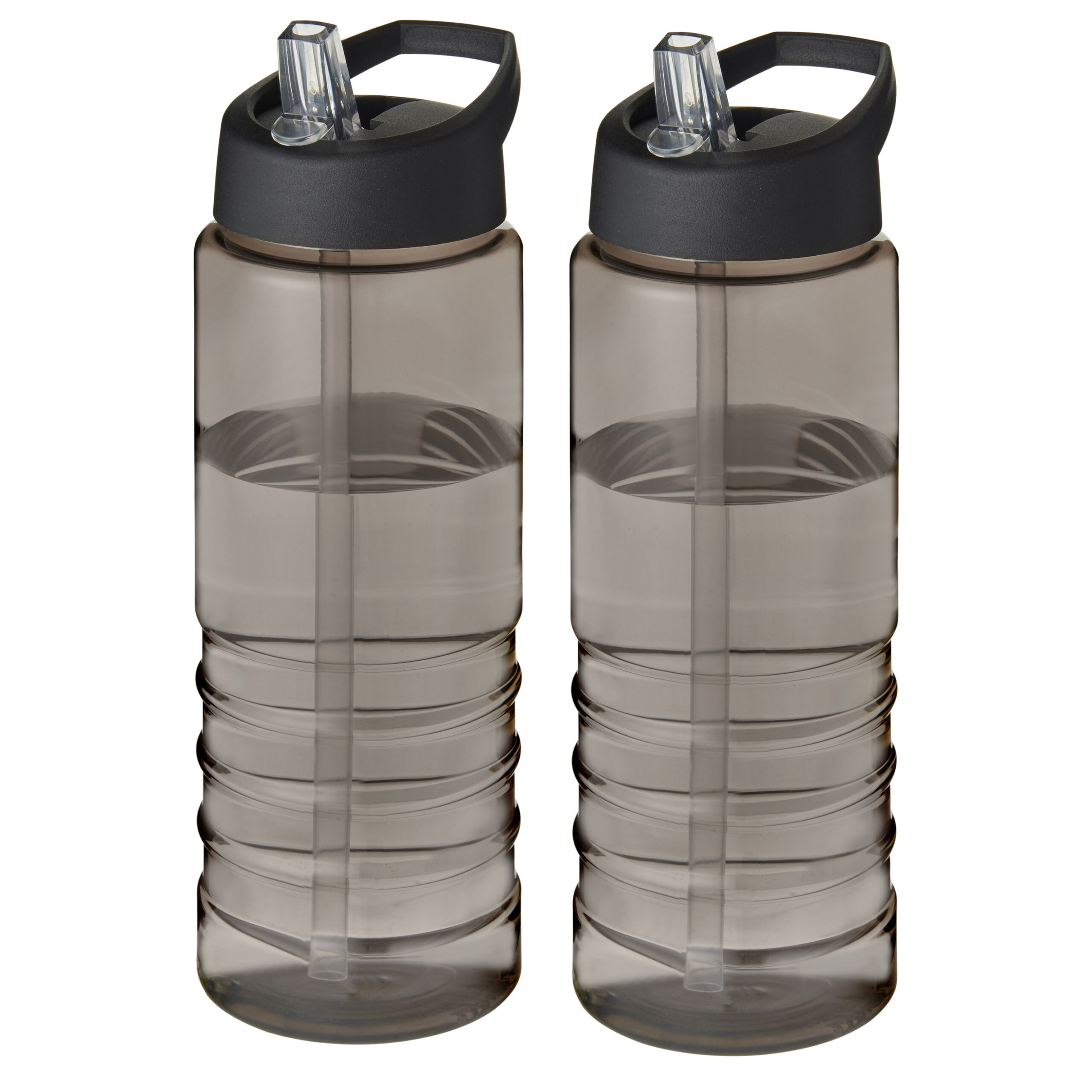 2x stuks sport bidon/drinkfles/waterfles gemaakt van gerecycled Hi-eco kunststof in de kleuren donkergrijs/zwart met een inhoud van 750 ml. Met handige tuit-deksel. Enkelwandige drinkfles met geribbeld ontwerp gemaakt van Prevented Ocean Plastic. Het plastic wordt verzameld binnen een straal van 50 km van een oceaankustlijn of grote waterweg die uitmondt in de oceaan. Dit wordt vervolgens gesorteerd en omgezet in hoogwaardig en voedselveilig gerecycled plastic. Voorzien van een morsbestendig deksel met open te trekken drinktuit.
