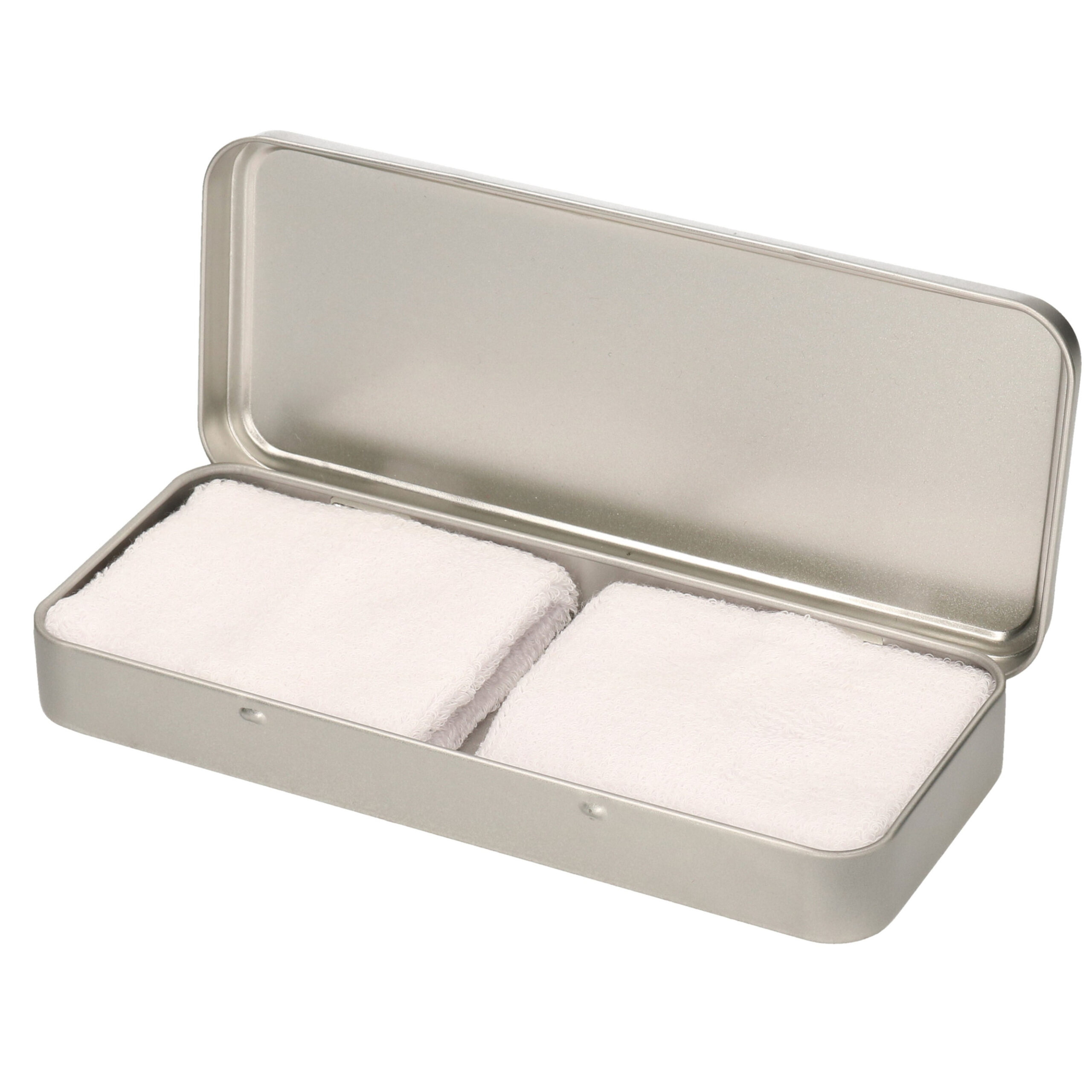 2x stuks witte sport zweetbandjes in metalen opslag/bewaar doosje. Het handige bewaar of cadeau doosje heeft een formaat van 8 x 18 cm en is 2 cm hoog. De zweetbandjes zijn van katoen/elasthan. U kunt ze gebruiken voor een verkleed party of tijdens het sporten. , Dit artikel bestaat uit:, 2x Myrtle Beach Zweetbandjes – gekleurd – voor de pols – teams maken – sporten, 1x Pennendoos/pennenblik – 8 x 18 x 2 cm – zilver – aluminium – opbergblikje