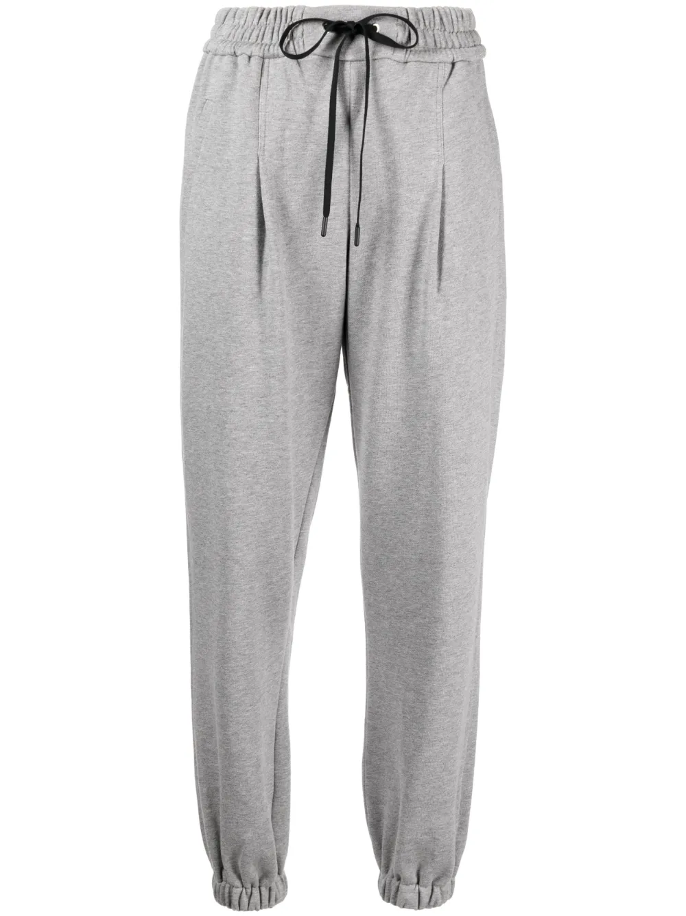 Gris, coton stretch, effet chiné, taille élastique à lien de resserrage, pinces, deux poches latérales fendues, coupe fuselée, chevilles élastiques.