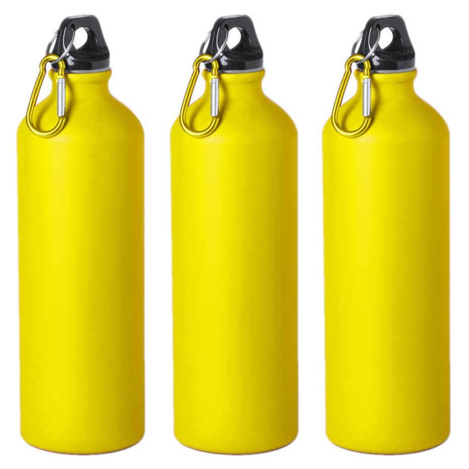3x Stuks aluminium waterfles/drinkfles geel met veiligheid schroefdop en karabijnhaak 800 ml. Afmeting: ca. D7,5 x H25 cm. Inhoud: ca. 800 ml, 80 cl. Gewicht: ca. 104 gram. Materiaal fles: aluminium. Geschikt voor magnetron: nee. Geschikt voor vaatwasser: nee. Geschikt voor vriezer: ja. Wordt geleverd in een kartonnen doosje.