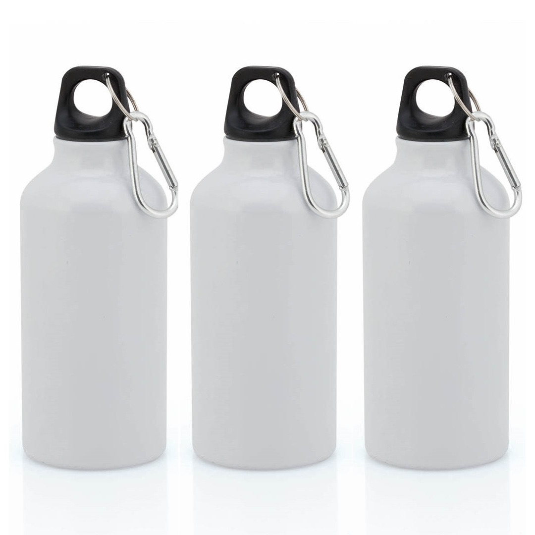 3x Stuks aluminium waterfles/drinkfles wit met veiligheid schroefdop en karabijnhaak 400 ml. Afmeting: ca. D6,5 x H17,5 cm. Inhoud: ca. 400 ml, 40 cl. Gewicht: ca. 65 gram. Materiaal fles: aluminium. Geschikt voor magnetron: nee. Geschikt voor vaatwasser: nee. Geschikt voor vriezer: ja. Wordt geleverd in een kartonnen doosje.