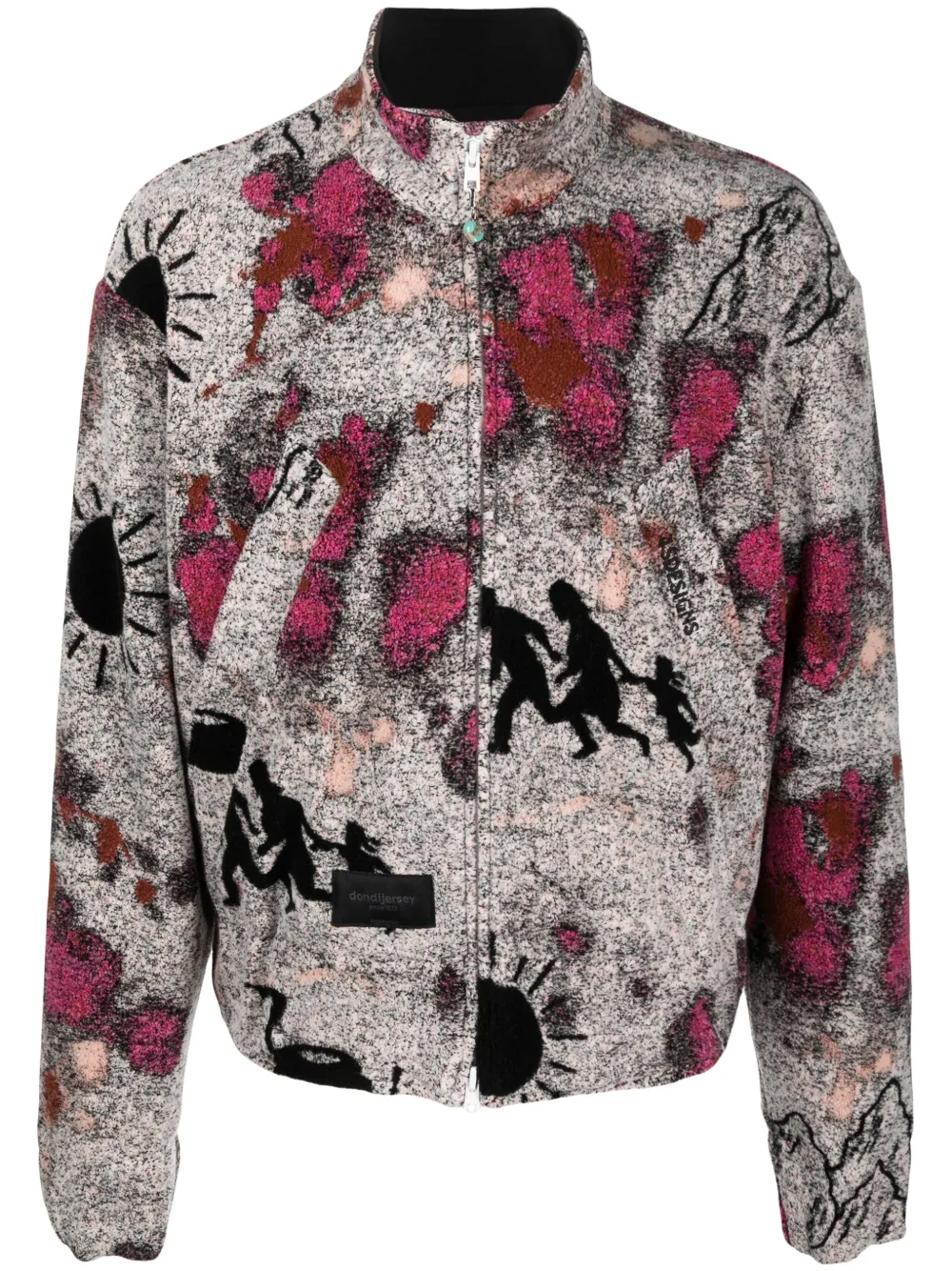 Gris clair, multicolore, imprimé abstrait, col montant, fermeture zippée devant, manches longues, deux poches latérales zippées, ourlet droit.