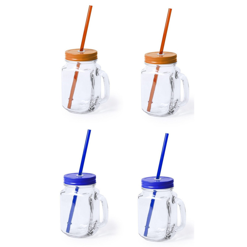 Set van 4x stuks Glazen Mason Jar drinkbekers/potjes met dop en rietje met een inhoud van 500 ml. Limonade, Fruit shakes of andere drankjes anti lekken drinkpotten bekers. Formaat ongeveer: 7,5 x 13,5 cm. Kleurencombinatie: 2x Blauw en 2x oranje. , Dit artikel bestaat uit:, 2x Mason Jar drinkbekers – glas – dop blauw met rietje – 500 ml – afsluitbaar – fruit shakes, 2x Mason Jar drinkbekers – glas – dop oranje met rietje – 500 ml – afsluitbaar – fruit shakes
