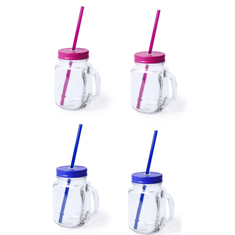 Set van 4x stuks Glazen Mason Jar drinkbekers/potjes met dop en rietje met een inhoud van 500 ml. Limonade, Fruit shakes of andere drankjes anti lekken drinkpotten bekers. Formaat ongeveer: 7,5 x 13,5 cm. Kleurencombinatie: 2x Blauw en 2x roze. , Dit artikel bestaat uit:, 2x Mason Jar drinkbekers – glas – dop blauw met rietje – 500 ml – afsluitbaar – fruit shakes, 2x Mason Jar drinkbekers – glas – dop roze met rietje – 500 ml – afsluitbaar – fruit shakes