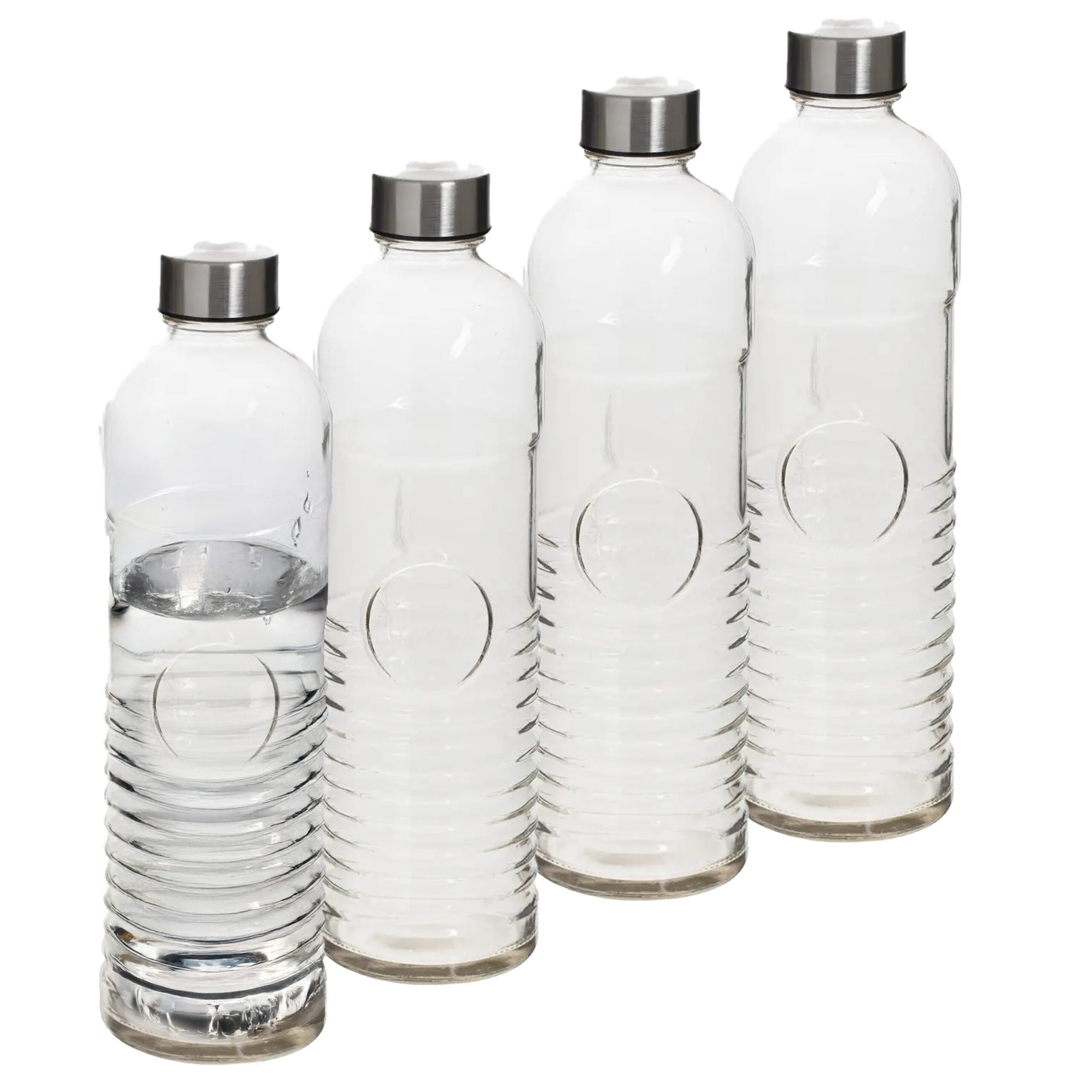 4x waterfles/drinkfles 1 liter van gehard ribbel glas. Deze stijlvolle waterfles van 1 liter is gemaakt van gehard ribbelglas en voorzien van een strak RVS schroefdeksel. Ideaal voor dagelijks gebruik thuis, op kantoor of tijdens het sporten. Dankzij het robuuste glas neemt de fles geen geuren of smaken op, wat zorgt voor een frisse drinkervaring ,elke keer opnieuw.