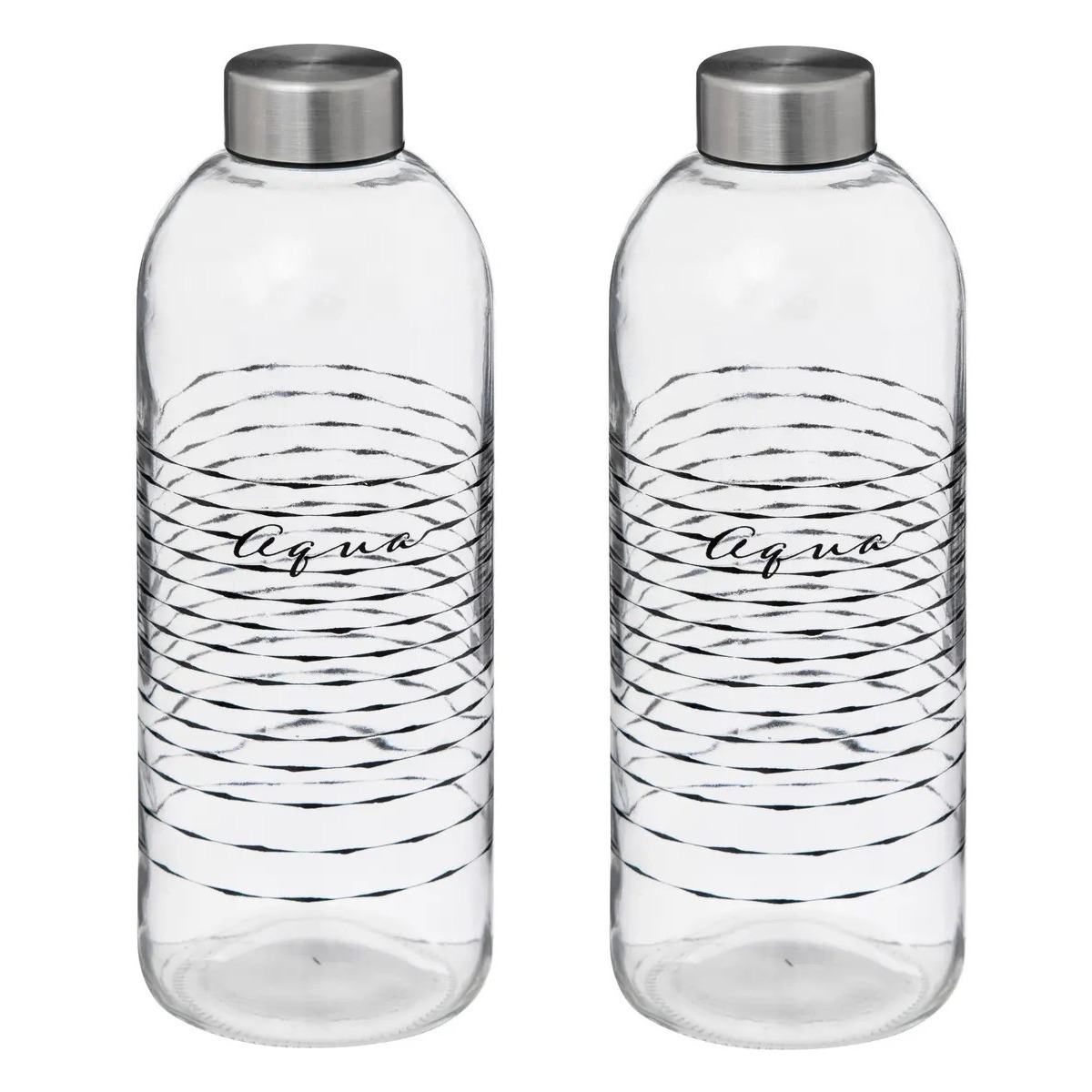 2x glazen waterfles/drinkfles in de kleur helder transparant voorzien van Aqua print met RVS dop 1000 ml. Afmeting: ca. D8 x H25 cm. Inhoud: ca. 1000 ml, 100 cl. Gewicht: ca. 400 gram. Materiaal fles: verhard glas. BPA-vrij: ja. Geschikt voor magnetron: nee. Geschikt voor vaatwasser: ja (max. 50 graden) de dop niet. Geschikt voor vriezer: ja. Sport bidon flessen.