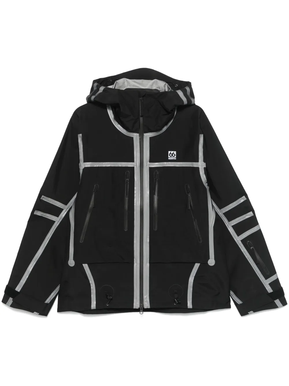 noir coque fermeture zippée à double sens sur le devant capuche à lien de resserrage col cheminée détails de coutures épaules tombantes manches longues poignets à fermeture scratch logo imprimé sur la poitrine poches multiples zippées logo imprimé à l’arrière sans doublure ourlet à lien de resserrage