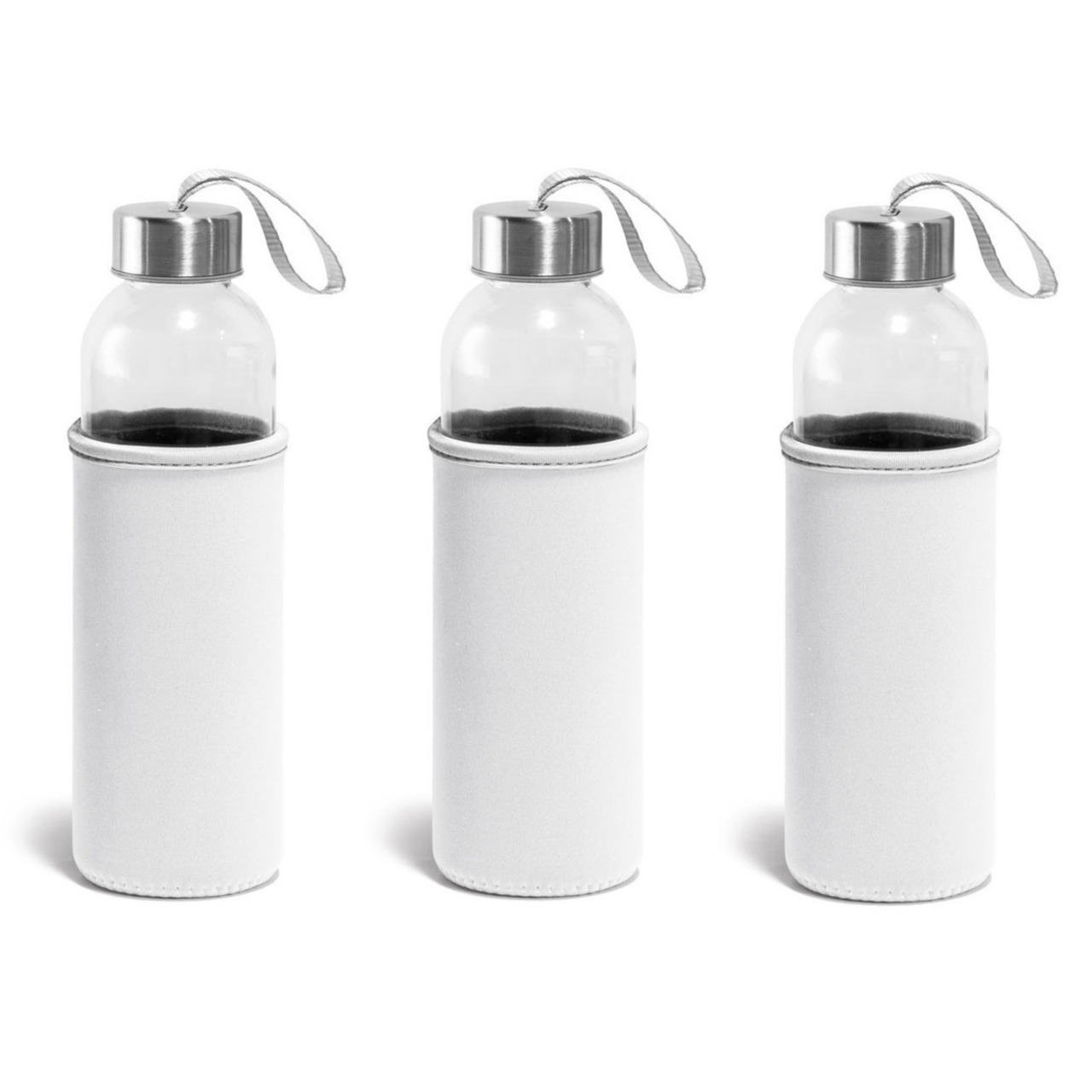 6x Glazen waterflessen/drinkflessen met witte soft shell hoes 520 ml. Transparanten glazen bidons/drinkflessen met aluminium dop en witte soft shell hoes. De inhoud per fles is ca. 520 ml. Formaat fles: ca. 6,5 cm in diameter en 22,5 cm in hoogte. Materiaal: glas, rvs en soft shell (stof). De flessen kunnen in de vaatwasser en zijn ook geschikt voor vriezer en magnetron.