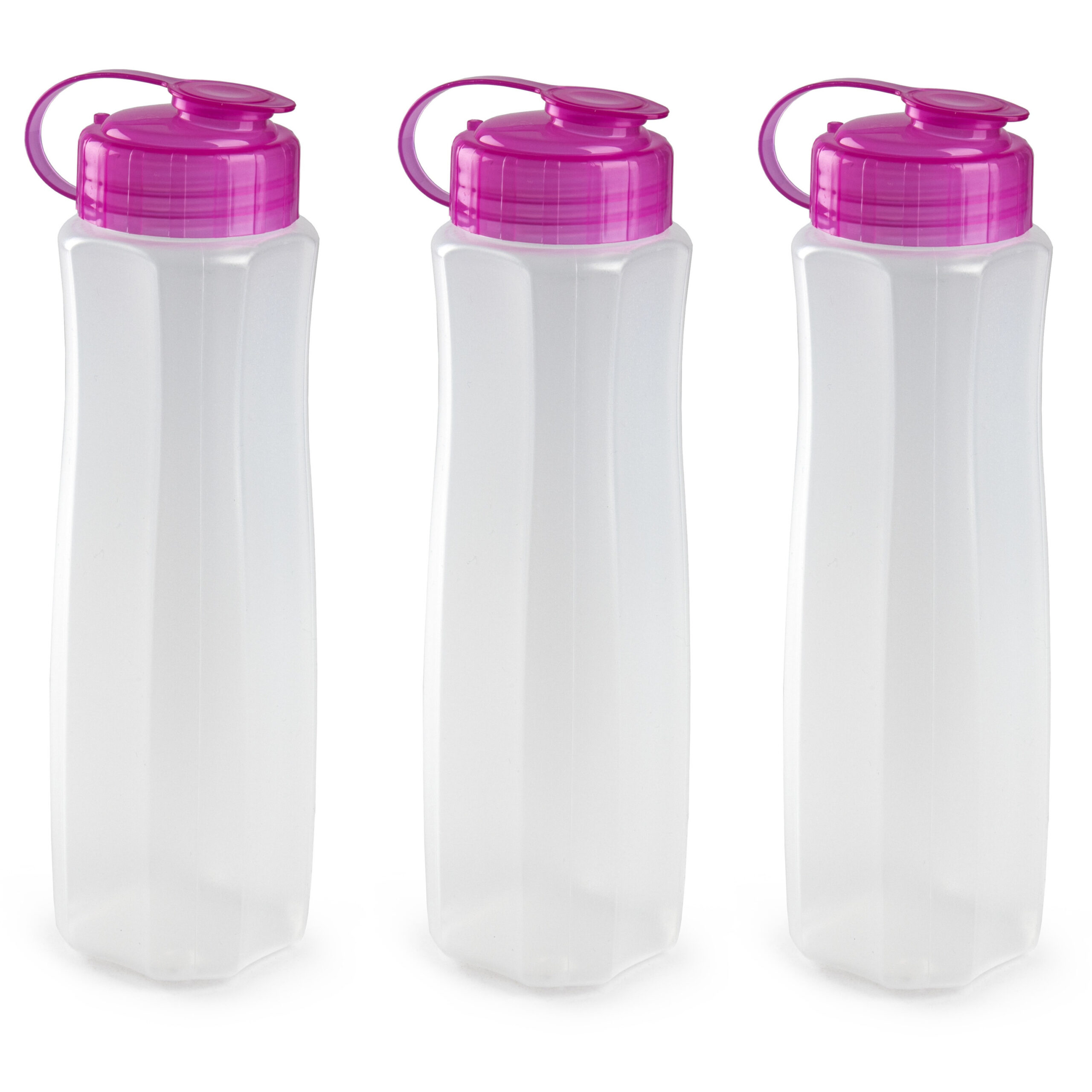 6x stuks kunststof waterflessen 1000 ml transparant met dop roze. Handige multifunctionele drinkflessen voor sapjes en water. Formaat: 28 x 8 cm. Kan in de vriezer en magnetron.