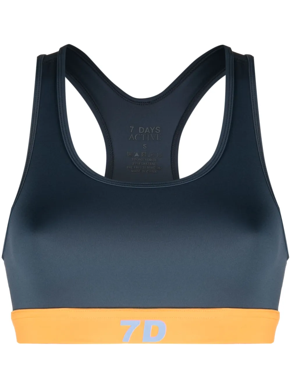 Bleu nuit, orange, logo imprimé sur le devant, col arrondi plongeant, bande sous-poitrine élastiquée, dos nageur, design à enfiler, construction stretch.