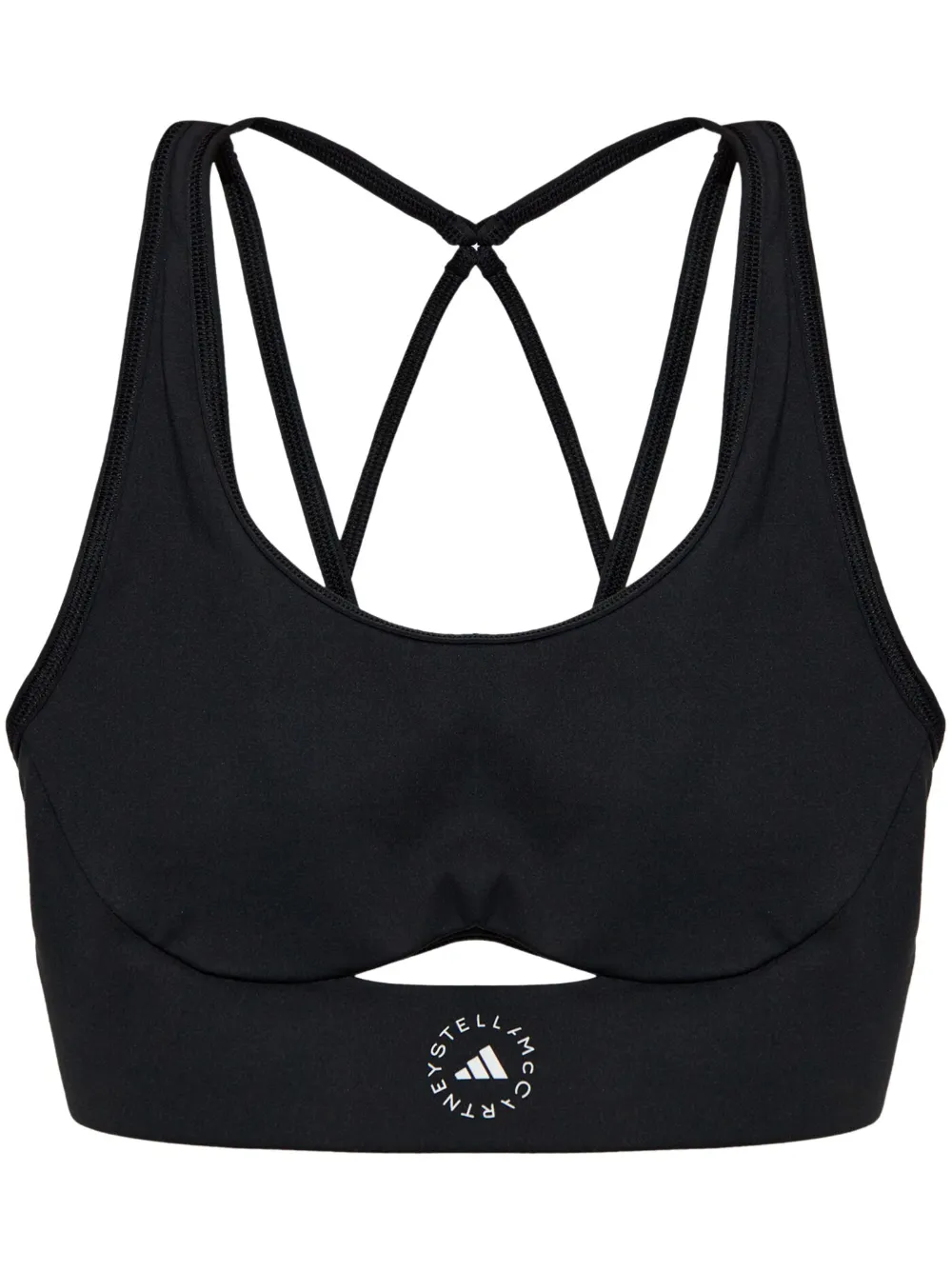 noir polyester recyclé mélangé bretelles fines bretelles croisées au dos col rond détails de découpes logo imprimé sur le devant ^