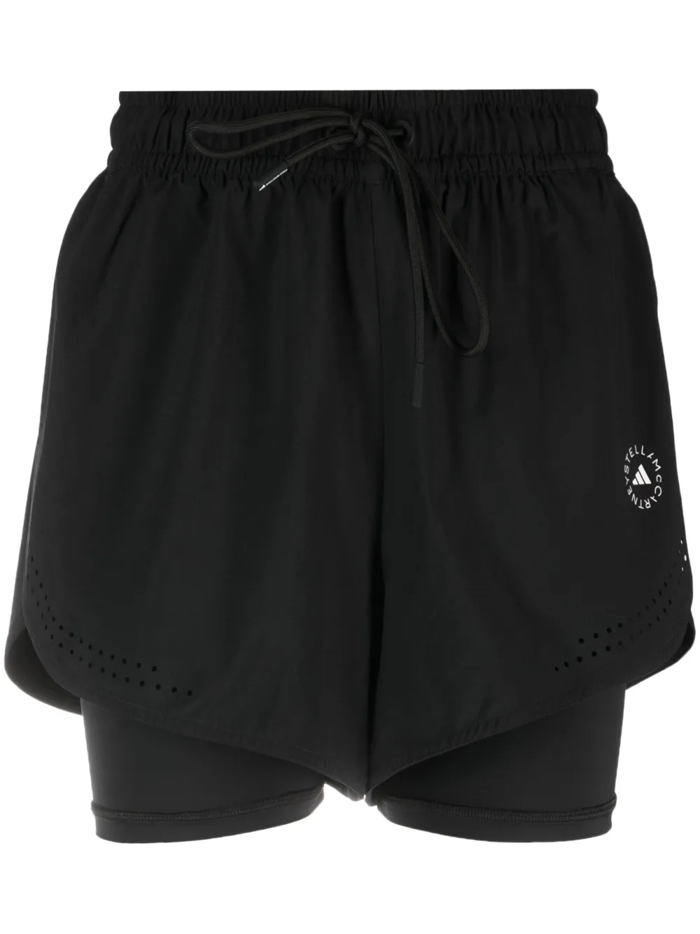 Noir, polyester recyclé mélangé, effet superposé, détails de perforations, logo imprimé sur le côté, taille élastique à lien de resserrage, taille haute, short intégré. .