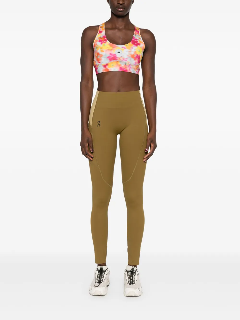 actieve goudkleurig/echt roze/helder roze gerecyclede polyesterblend technische jersey instapmodel stretch design all-over bloemenprint logoprint op de voorkant ronde hals mouwloos racerback uitneembare pads medium ondersteuning rechte zoom cropped