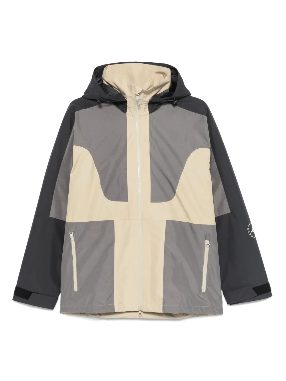 taupe fermeture zippée à double sens sur le devant capuche à lien de resserrage deux poches latérales zippées poche intérieure zippée