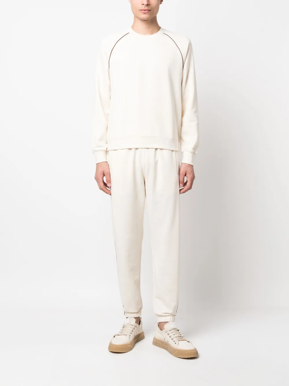 Crèmewit, katoenmix, gestreept detail, ronde hals, lange mouwen en rechte zoom.