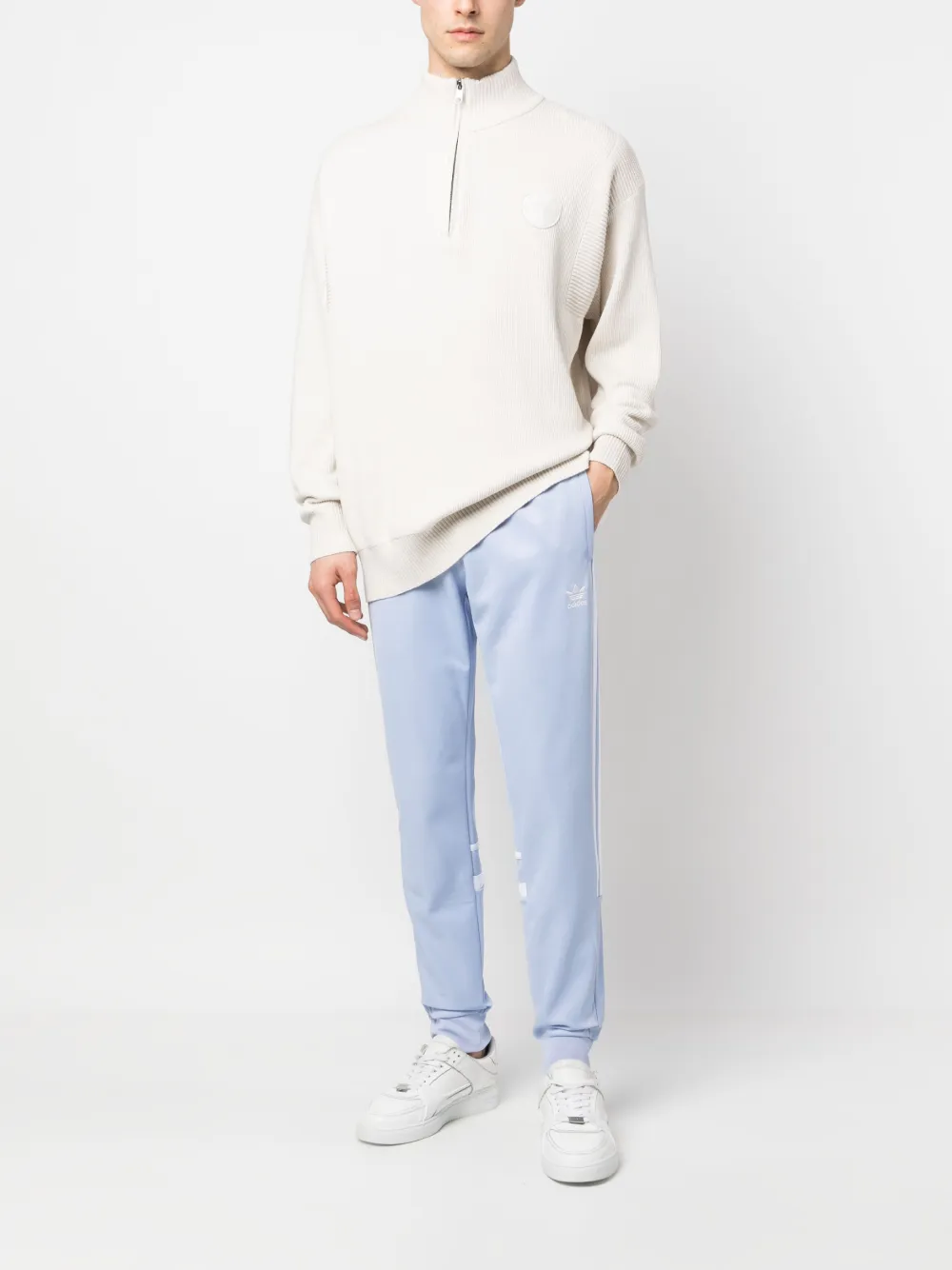 Lichtblauw, kenmerkend trefoil logodetail, geborduurd logo op de voorkant, geborduurd logo aan de achterkant, zijstreep, elastische tailleband en rits bij de enkels.