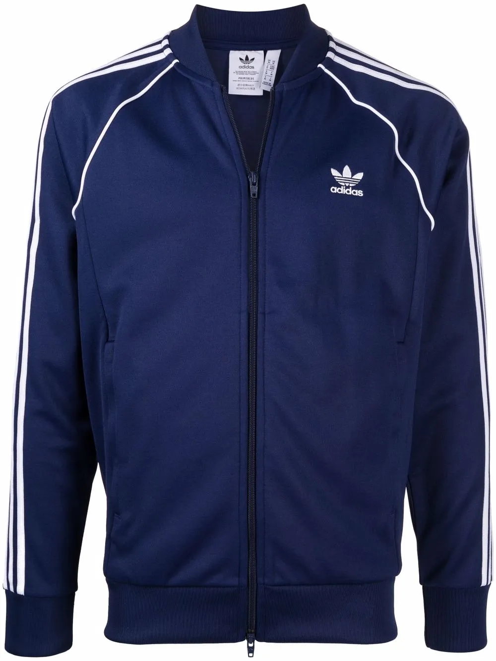 Bleu, blanc, polyester recyclé, trèfle à trois feuilles signature, fermeture zippée devant, manches longues, poignets élastiqués, ourlet élastiqué.