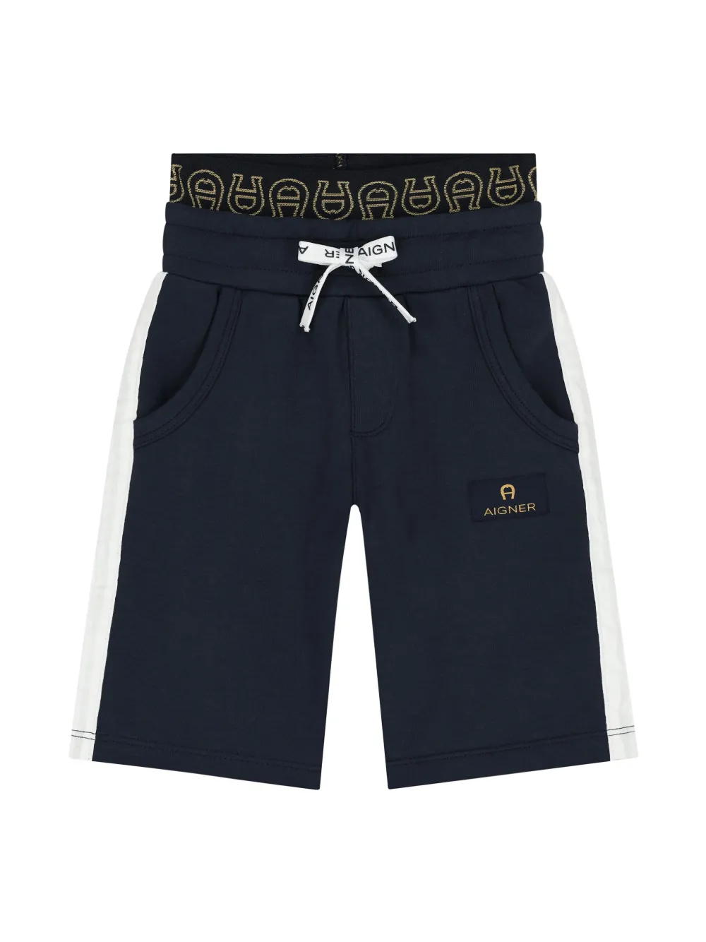 bleu marine coton stretch texture jersey appliqué logo taille élastique à lien de resserrage ceinture à logo poches latérales arrondies rayures latérales ourlet droit