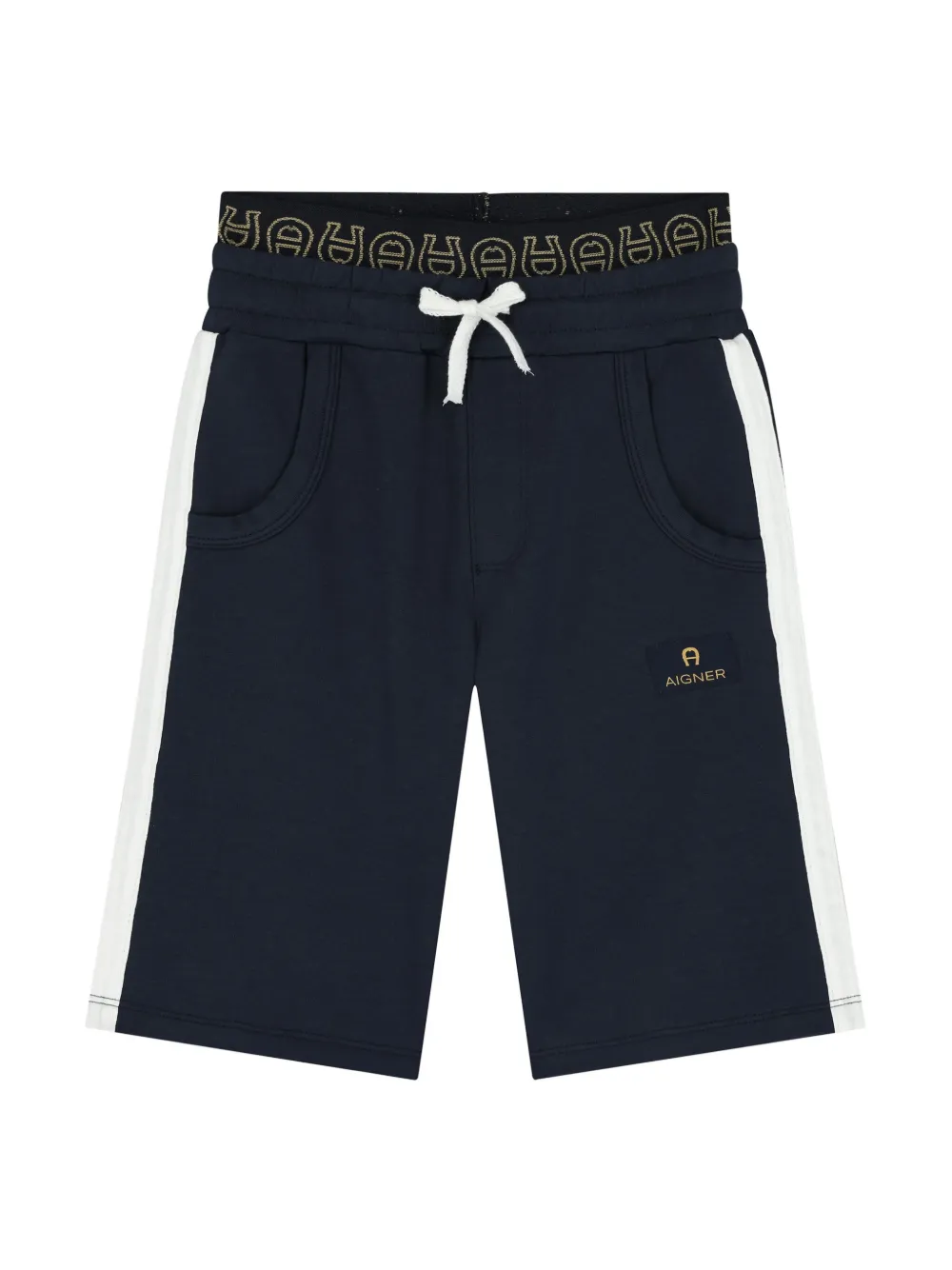 bleu marine coton stretch appliqué logo taille élastique à lien de resserrage ceinture élastique à logo poches latérales arrondies rayures latérales ourlet droit