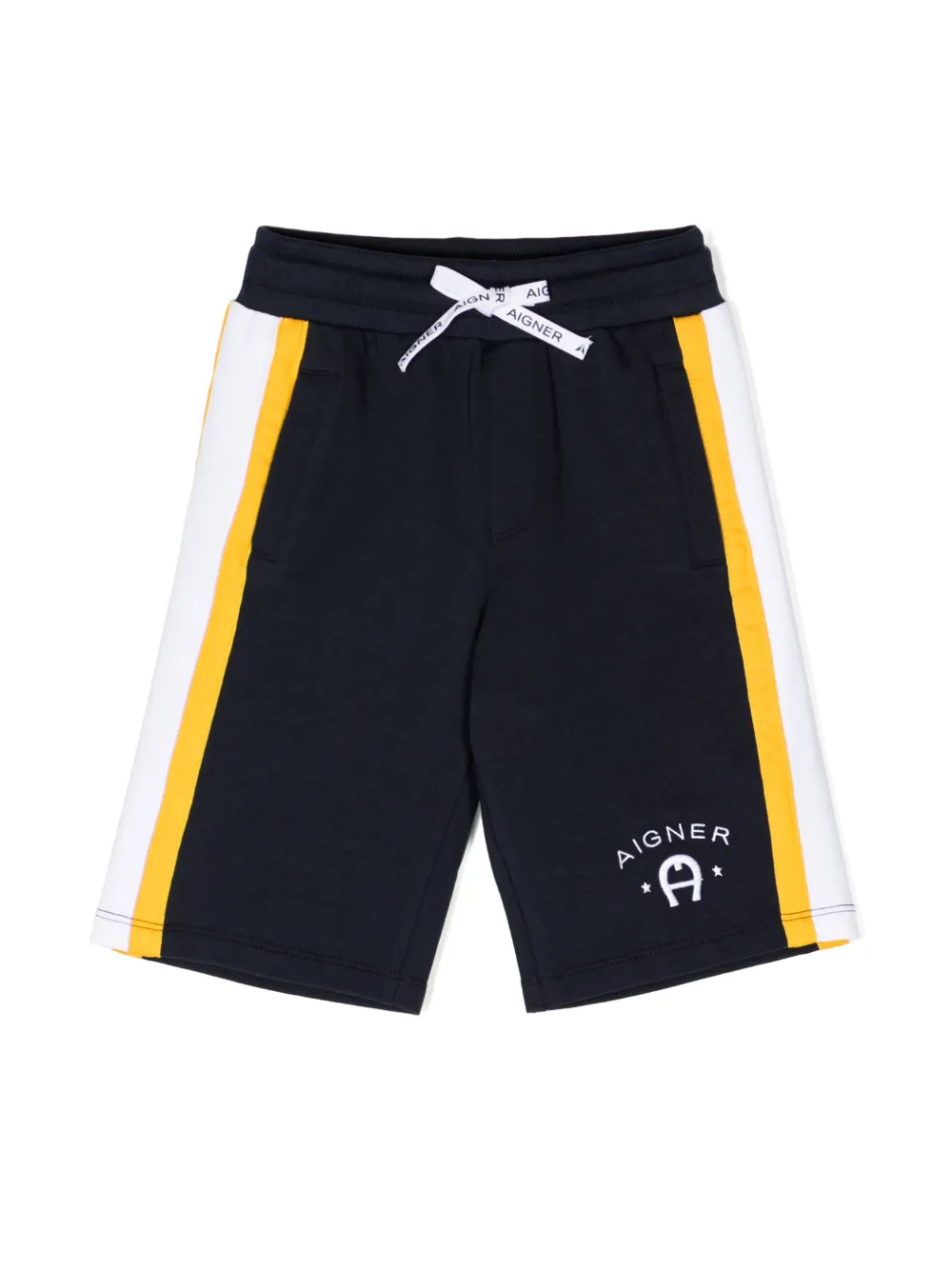 Bleu marine, blanc, jaune moutarde, logo brodé sur le devant, taille élastique à lien de resserrage, détail de rayure latérale, poches latérales fendues, ourlet droit.
