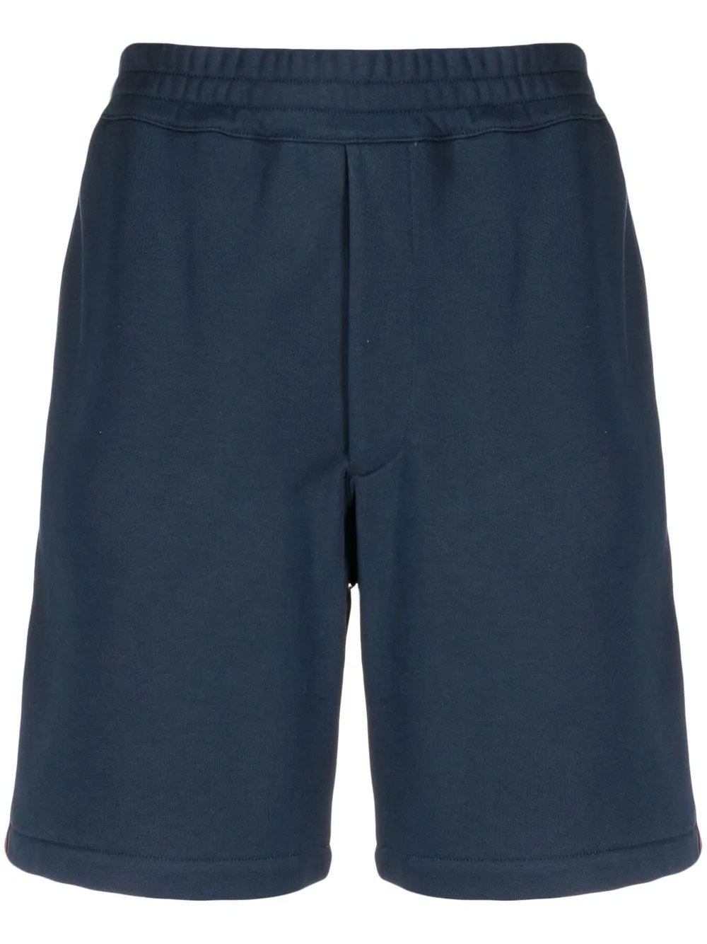 Bleu marine, rouge, coton, finition à bande logo, ceinture élastique, deux poches latérales fendues, poche arrière zippée.