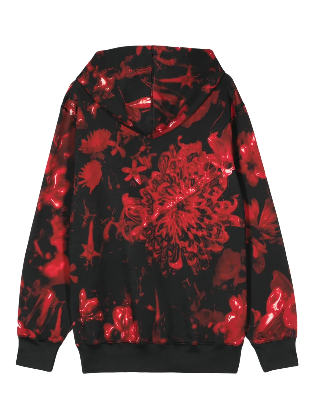 zwart/rood katoen jersey textuur all-over bloemenprint pullover design capuchon met trekkoordsluiting lange mouwen geribbelde manchetten en zoom geborduurd logo op de borst opgestikte zak aan de voorkant badstof voering rechte zoom