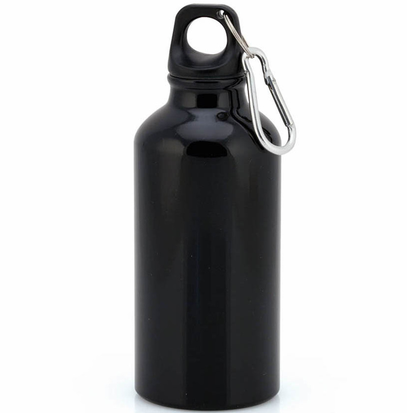 Aluminium waterfles/drinkfles in de kleur zwart met veiligheid schroefdop en karabijnhaak en inhoud van 400 ml. Afmeting: ca. D6,5 x H17,5 cm. Inhoud: ca. 400 ml, 40 cl. Gewicht: ca. 65 gram. Materiaal fles: aluminium. Geschikt voor magnetron: nee. Geschikt voor vaatwasser: nee. Geschikt voor vriezer: ja. Wordt geleverd in een kartonnen doosje.