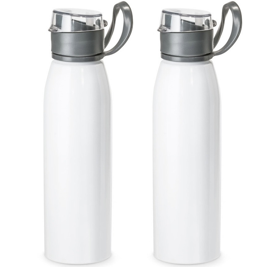 2 Stuks aluminium waterfles/drinkfles in het wit met klepdop en handvat. Afmetingen: ca. D6,5 x H25 cm. Inhoud: ca. 650 ml, 65 cl. Gewicht: ca. 124 gram. Materiaal fles: aluminium met kunststof. BPA-vrij: ja. Geschikt voor magnetron: nee. Geschikt voor vaatwasser: nee. Geschikt voor vriezer: ja. Sportfles of bidon.