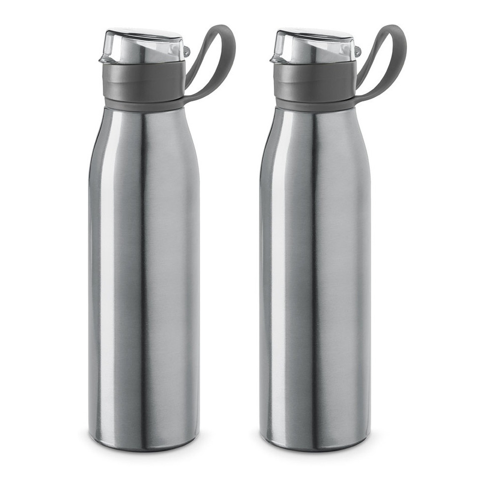 2x aluminium waterfles/drinkfles in het zilver met klepdop en handvat. Afmetingen: ca. D6,5 x H25 cm. Inhoud: ca. 650 ml, 65 cl. Gewicht: ca. 124 gram. Materiaal fles: aluminium met kunststof. BPA-vrij: ja. Geschikt voor magnetron: nee. Geschikt voor vaatwasser: nee. Geschikt voor vriezer: ja. Sportfles of bidon.