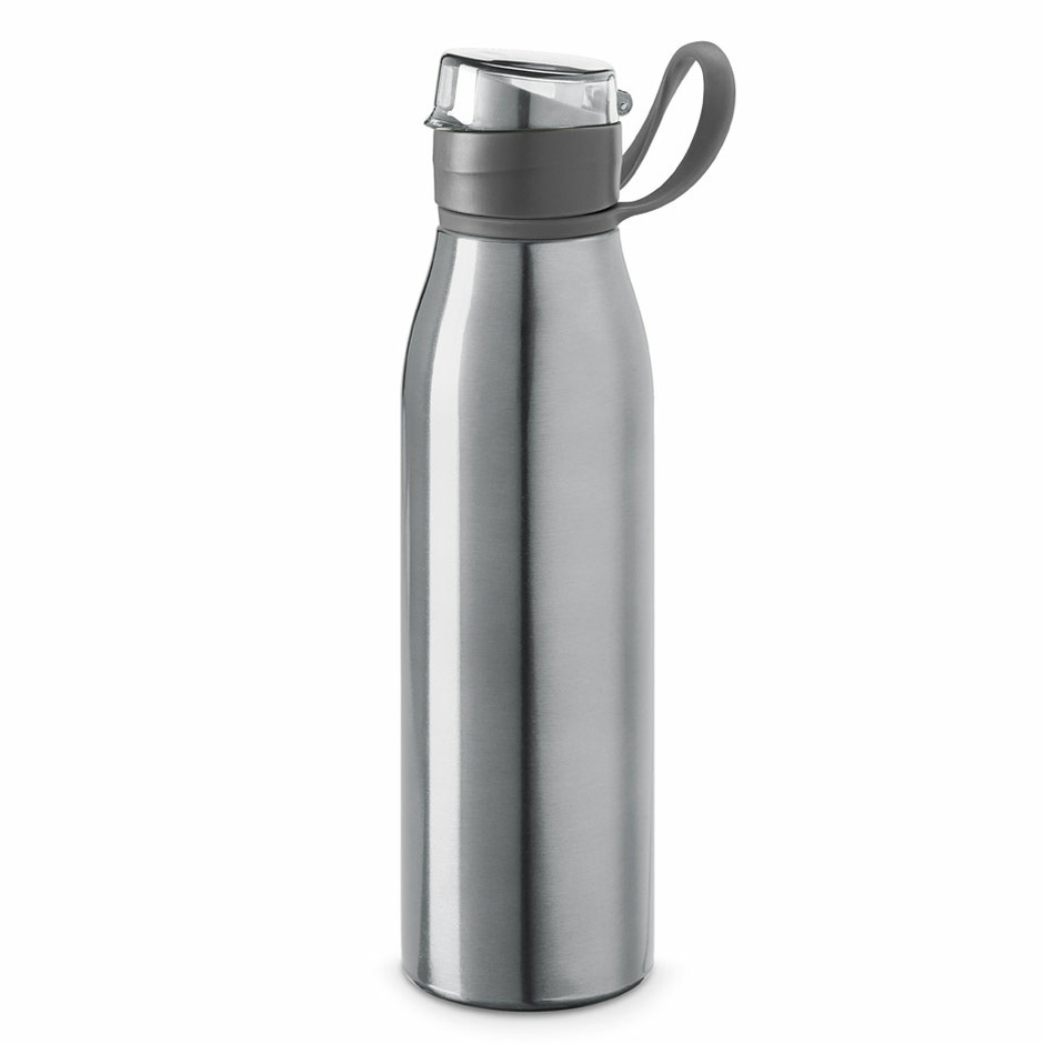 Aluminium waterfles/drinkfles in het zilver met klepdop en handvat. Afmetingen: ca. D6,5 x H25 cm. Inhoud: ca. 650 ml, 65 cl. Gewicht: ca. 124 gram. Materiaal fles: aluminium met kunststof. BPA-vrij: ja. Geschikt voor magnetron: nee. Geschikt voor vaatwasser: nee. Geschikt voor vriezer: ja. Sportfles of bidon.