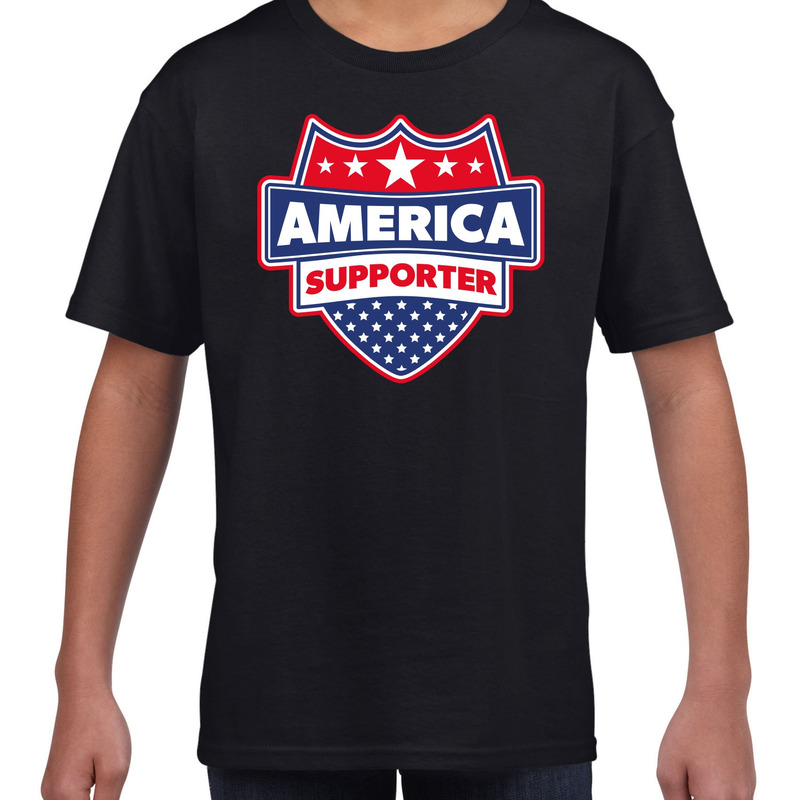 Amerika / America schild supporter t-shirt zwart voor kinderen. Op dit zwarte shirt staat een schild met de tekst: America supporter. Het schild heeft de kleuren van de Amerikaanse vlag!