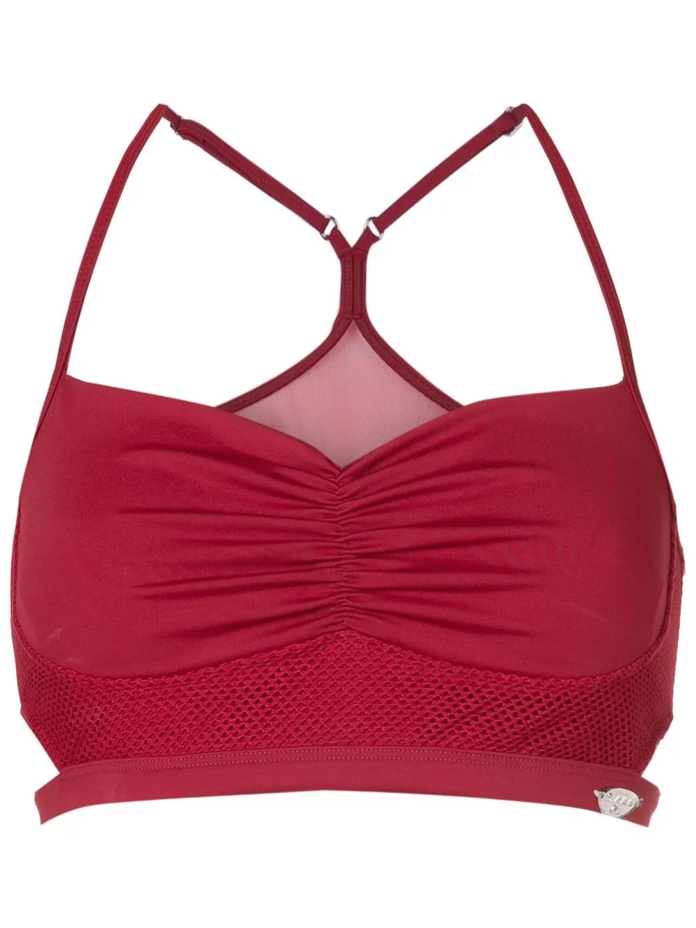 Carmin, construction stretch, empiècement en mesh, plaque logo argentée, bretelles fines ajustables, encolure cœur.