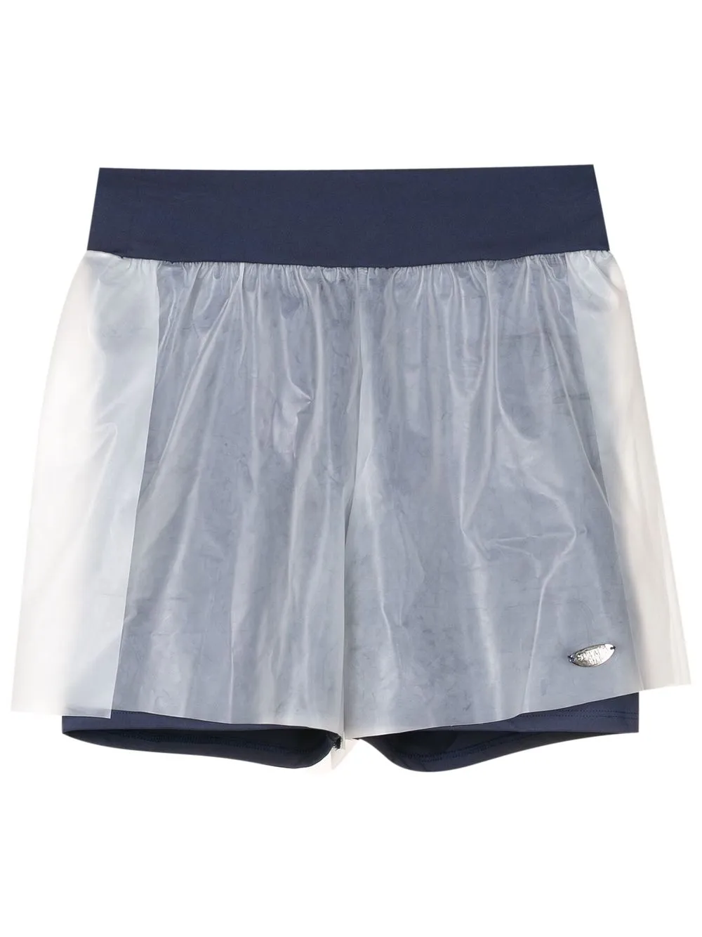 Bleu marine, effet superposé, ceinture élastique, plaque logo argentée, coupe courte.