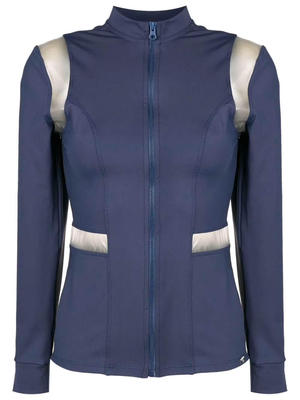 Bleu marine, effet de transparence, construction stretch, col montant, fermeture zippée devant, plaque logo argentée, manches longues, ourlet droit.