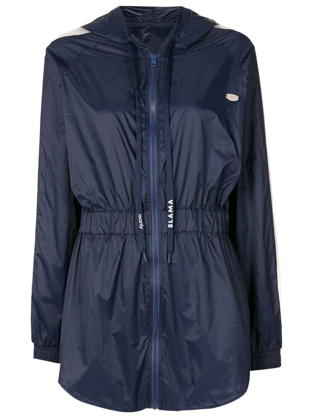 Bleu nuit, capuche à lien de resserrage, empiècements semi-transparents, fermeture zippée devant, ceinture élastique, manches longues, poignets élastiqués, ourlet incurvé.