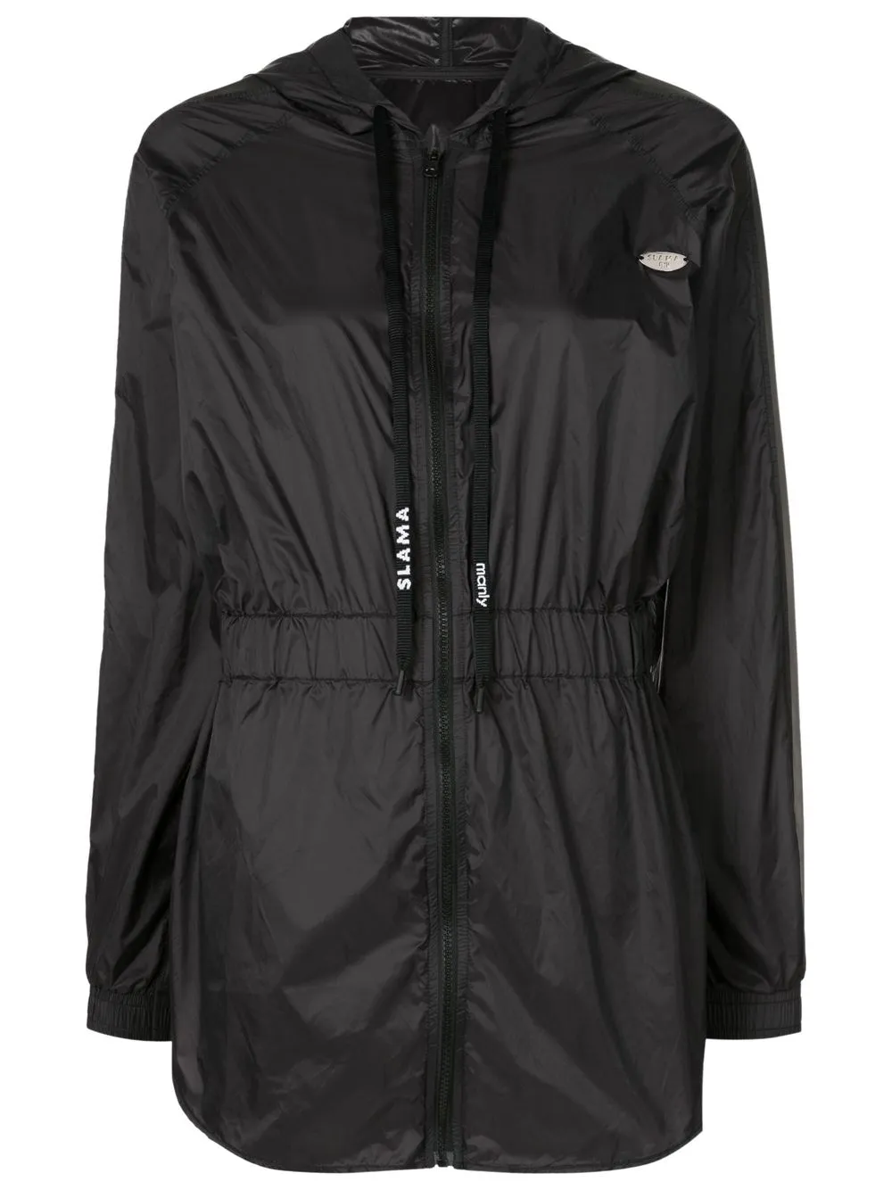 Noir, capuche à lien de resserrage, empiècements semi-transparents, fermeture zippée devant, ceinture élastique, manches longues, poignets élastiqués, ourlet incurvé.