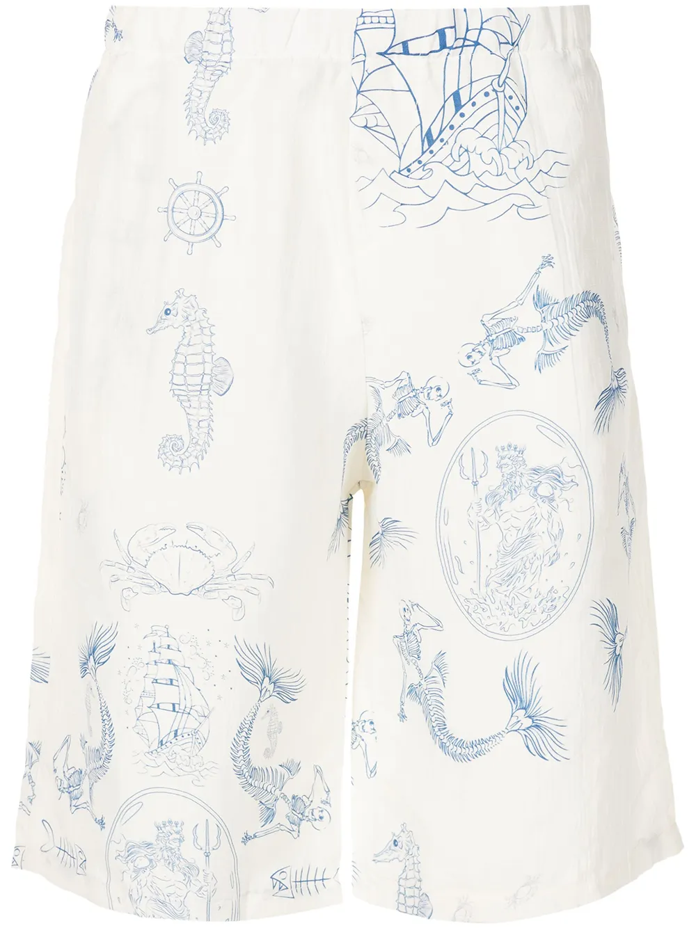 blanc crème/bleu cobalt lin et soie mélangés imprimé graphique intégral longueur au dessus du genou poches latérales fendues ceinture élastique
