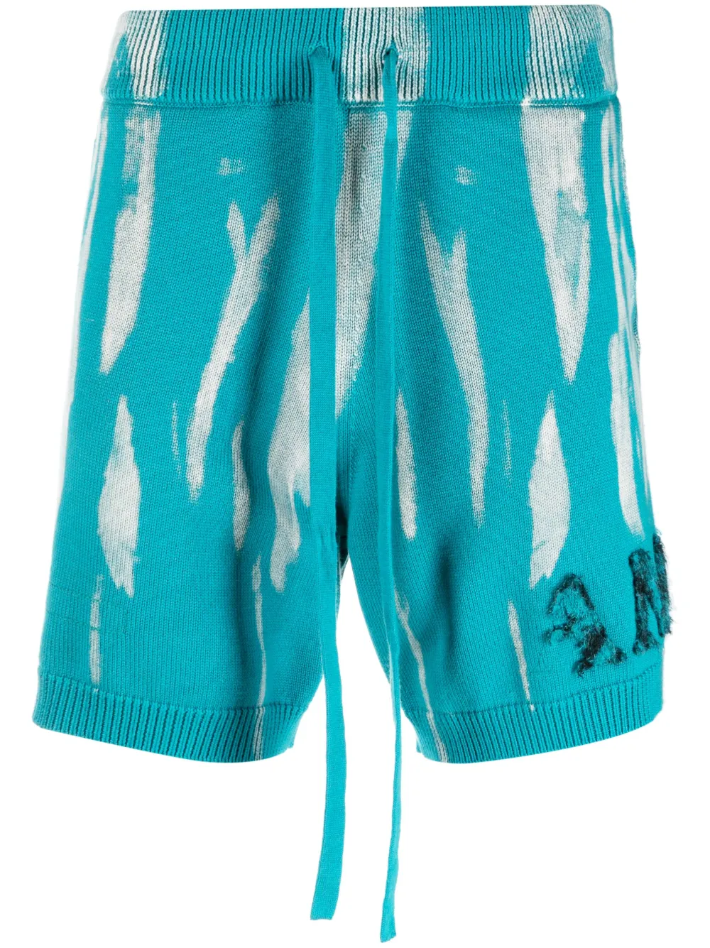 Bleu-vert turquoise, noir/blanc, coton et cachemire mélangés, imprimé abstrait, logo brodé, taille élastique à lien de resserrage, longueur au dessus du genou.