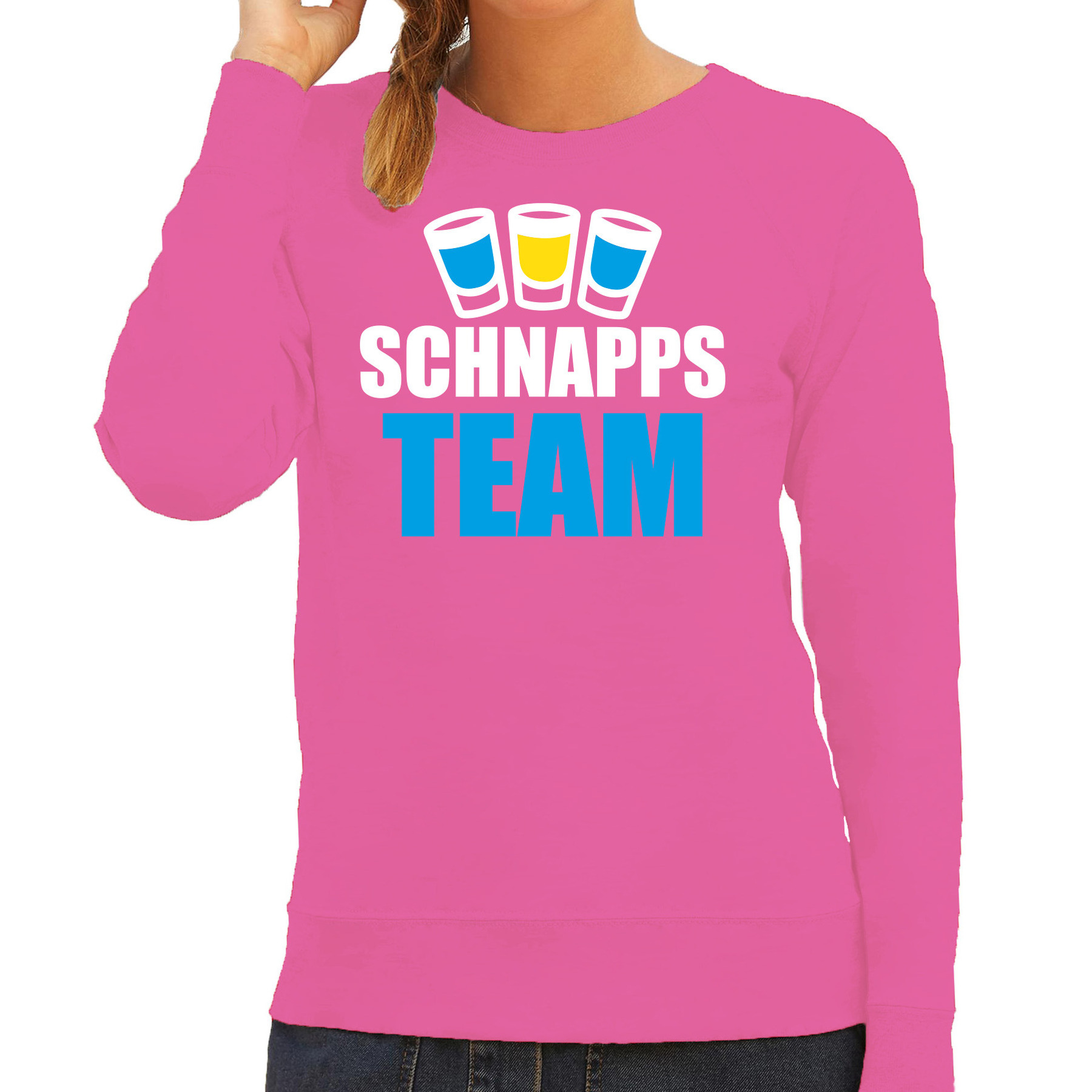 Fout wintersport verkleed t-shirt voor dames in de kleur roze. Dit leuke shirt is bedrukt met de tekst: schnapps team. Trek het t-shirt aan op je volgende winter sport vakantie als je altijd in de Apres Skihut te vinden bent met je vriendengroep! Het shirt is ook grappig om cadeau te geven aan jouw apres ski buddies. Uiteraard ook leuk om te dragen naar carnaval of een themafeest. Materiaal: 80% katoen/20% polyester, 240 grams kwaliteit. Merk: Bellatio Decorations.