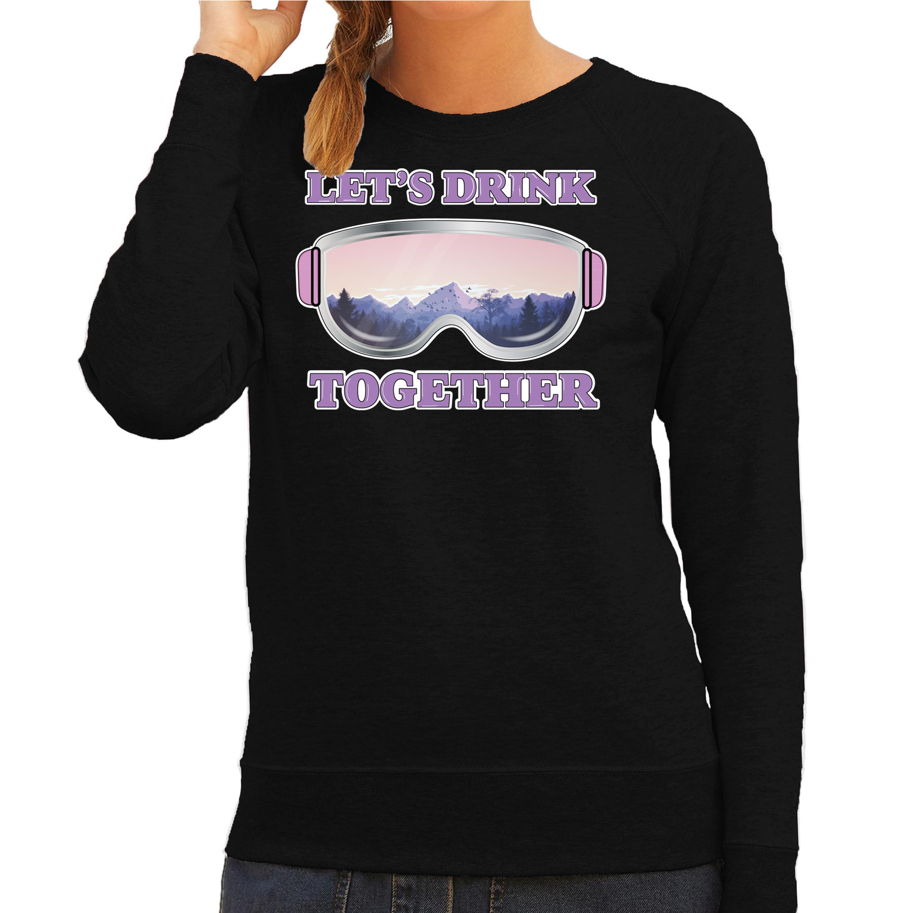 Foute wintersport verkleed sweater voor dames in de kleur zwart. Deze leuke trui is bedrukt met de tekst: Let’s Drink Together, en een afbeelding van een skibril. Trek deze trui aan op je volgende winter sport vakantie als je altijd in de Apres Skihut te vinden bent! De sweater is ook grappig om cadeau te geven aan jouw apres ski buddy. Uiteraard ook leuk om te dragen naar carnaval of een themafeest. Materiaal: 80% katoen / 20% polyester, 240 grams kwaliteit. Merk: Bellatio Decorations.