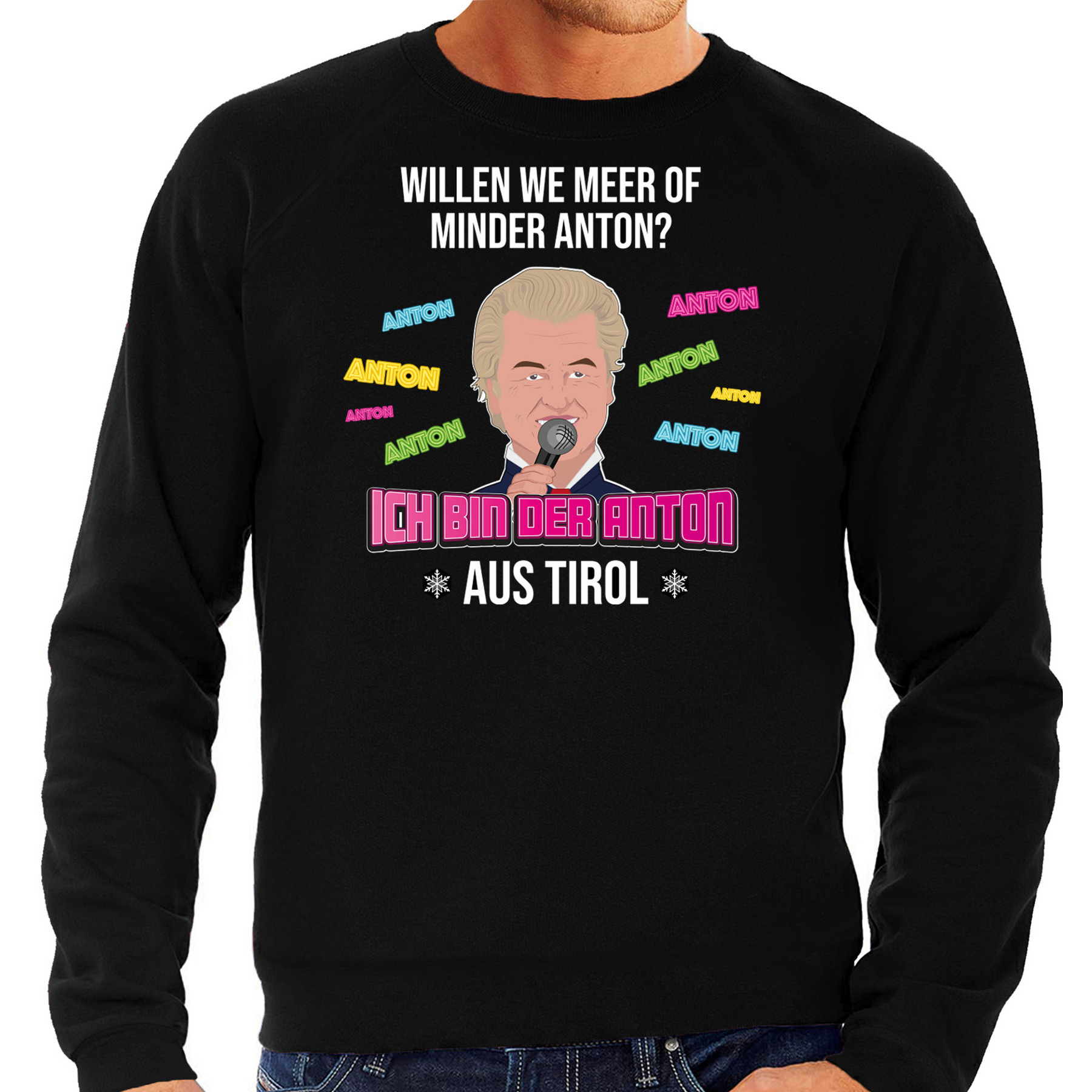 Foute wintersport verkleed sweater voor heren in de kleur zwart. Deze leuke trui is bedrukt met de tekst: Willen we meer of minder Anton? Ich bin der Anton aus tirol. Met Geert Wilders en een microfoon. Trek deze trui aan op je volgende winter sport vakantie als je altijd in de Apres Skihut te vinden bent! De sweater is ook grappig om cadeau te geven aan jouw apres ski buddy. Uiteraard ook leuk om te dragen naar carnaval of een themafeest. Materiaal: 80% katoen/20% polyester, 240 grams kwaliteit. Merk: Bellatio Decorations.