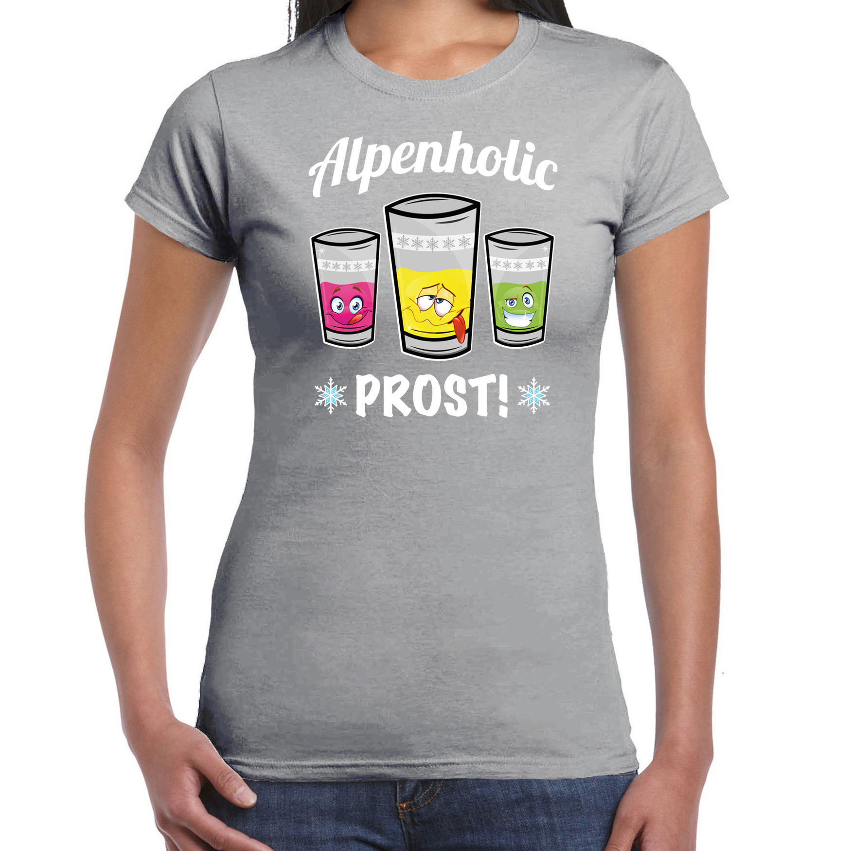 Fout wintersport verkleed t-shirt voor dames in de kleur grijs. Dit leuke t-shirt is bedrukt met de tekst: Alpenholic, Prost. Met gevulde shotglazen en grappige gezichten. Trek dit shirt aan op je volgende winter sport vakantie als je altijd in de Apres Skihut te vinden bent! Het t-shirt is ook grappig om cadeau te geven aan jouw apres ski buddy. Uiteraard ook leuk om te dragen naar carnaval of een themafeest. Materiaal: 145 grams, 100% katoen. Merk: Bellatio Decorations.